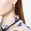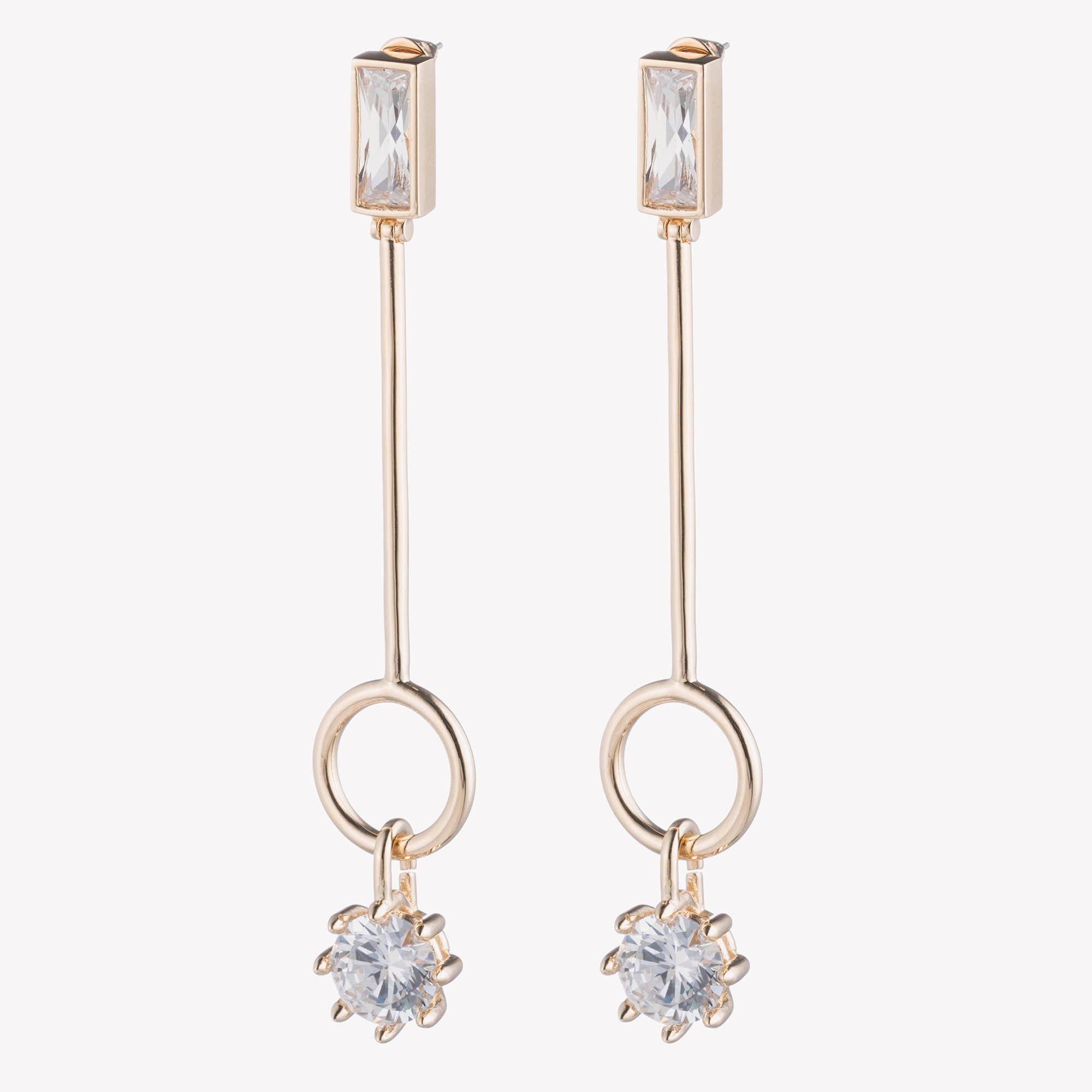 These classic earrings, finished in 12 Karat Gold, are composed of a linear baguette crystal topping a classic piece of hardware and hung with a pendulum of a round faceted crystal. An updated version of an evening earring, the Baguette Estate Line Earrings can be mismatched by combining one side with The Baguette Estate Drop Earring.