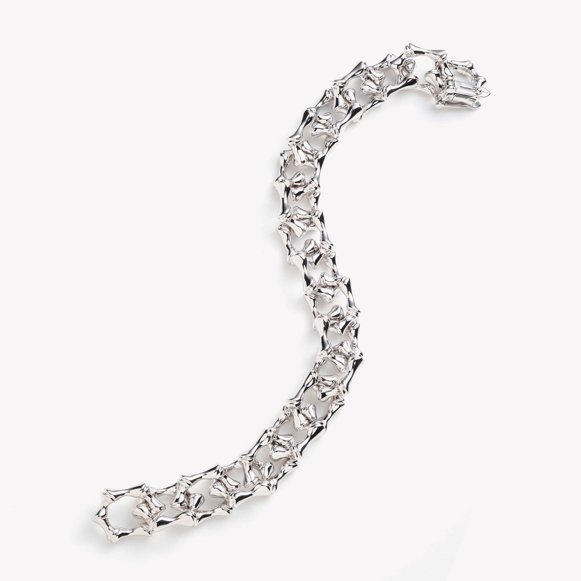 The Bambù Link Bracelet, finished in Silver, is a hand-linked chain bracelet, composed of individual stations of hand carved links in a bamboo motif. This bracelet can be worn on its own or alongside a thin silver cuff. Entirely made by hand, this unique bracelet has been created to ensure fluid movement. A hidden closure has been cleverly built into the final link, secure with a custom safety latch.