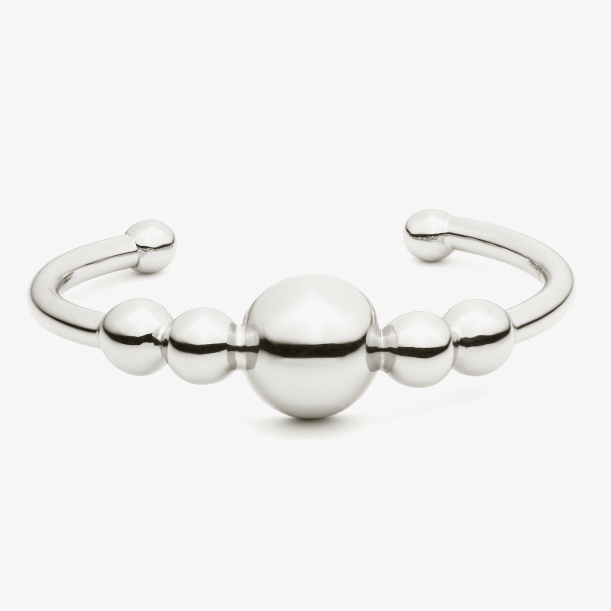 The Sphere Cuff, finished in Silver, HAS BEEN CREATED BY HAND, formed from five joined half-spheres. SURPRISINGLY LIGHTWEIGHT, THIS CUFF HAS BEEN FINISHED WITH CUSTOM CAGE WORK ON THE BACKSIDE AND EASILY SLIPS ONTO THE WRIST. EACH ENDING HAS BEEN FINISHED WITH A SMALL ORB, TO ENSURE COMFORT WHEN SLIDING OVER THE WRIST.