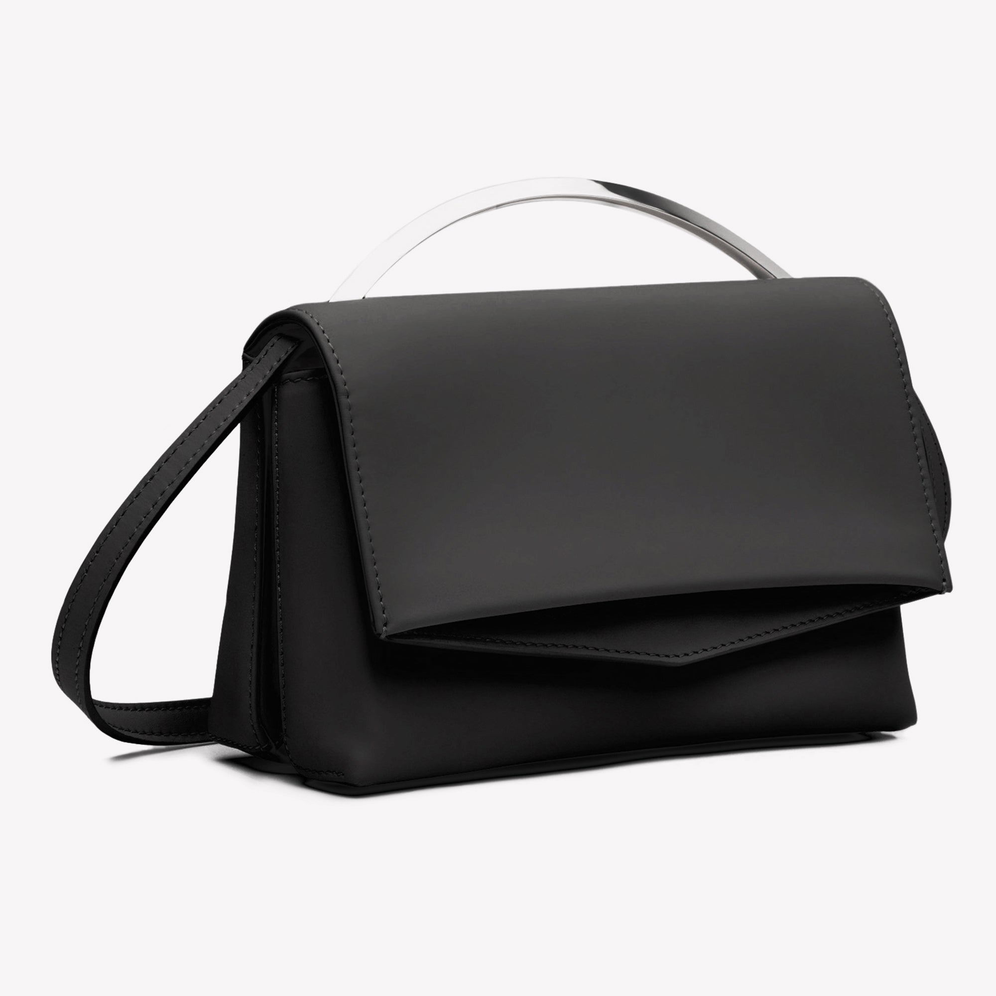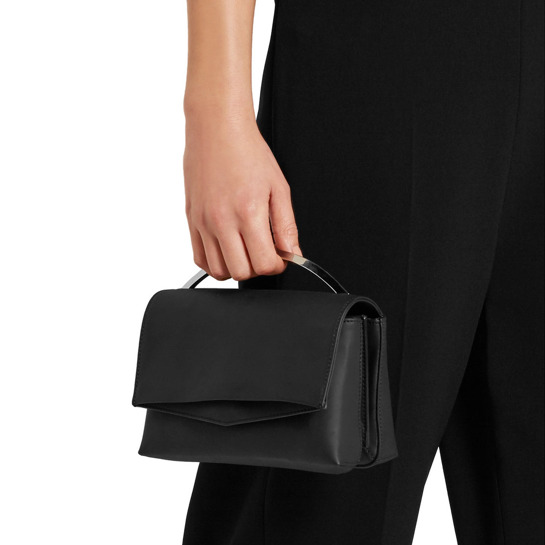 The Eddie Borgo Boyd Vanity Shoulder Bag has been created in black leather and topped with a signature sculpted handle, finished in Silver. A pocketed faille-lined interior was considered so that you do not need to carry a wallet. The detachable shoulder strap provides an alternative carry option for busy days.