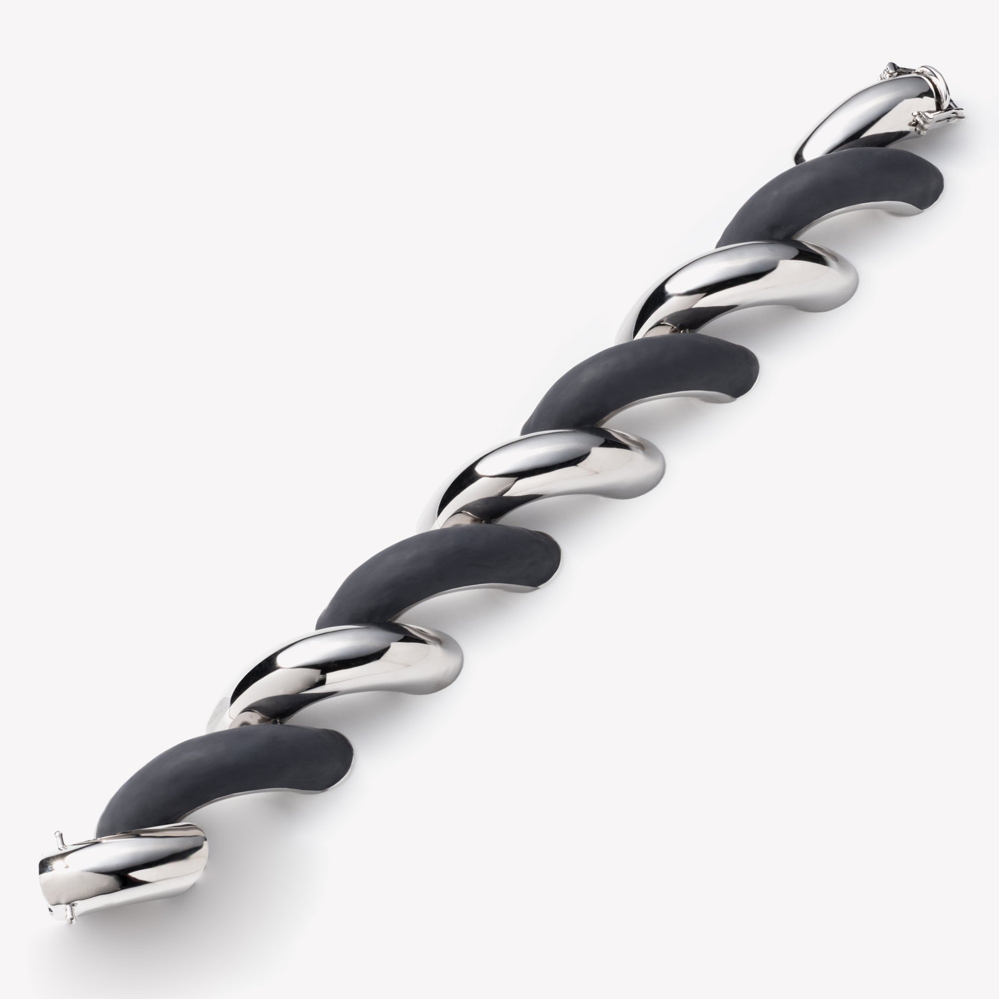 The Cloisonné Large Torsade Bracelet, finished in Silver, is composed of nine oversized, polished San Marco links; alternating between polished silver and hand applied cloisonné enamel in a midnight blue. Each station is pinned together by hand to create our signature fluidity and movement. Close with a custom Eddie Borgo box closure, secures with a double safety latch.