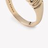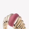 The Cloisonné Torsade Bombay Ring has been finished in both 12 Karat Gold and hand applied matte cloisonné enamel in a rouge pink. This elegant, repeated s-curve shape graduates in size as it wraps around the finger. A hollowed interior and caged backing for comfort.