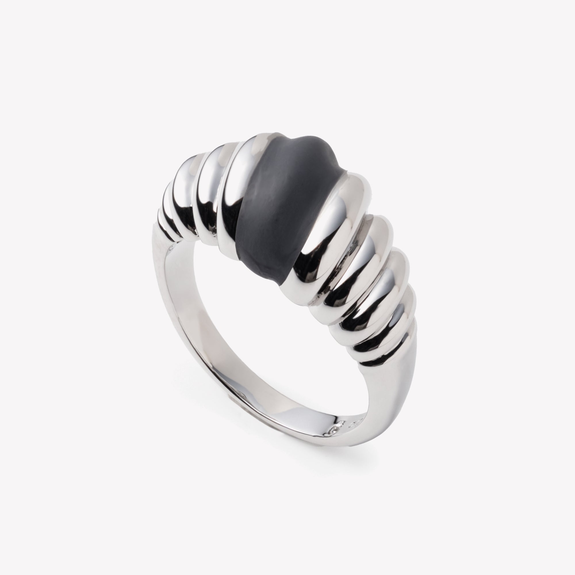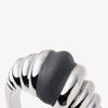 The Cloisonné Torsade Bombay Ring has been finished in Silver and hand applied matte cloisonné enamel in a midnight blue. This elegant, repeated s-curve shape graduates in size as it wraps around the finger. A hollowed interior and caged backing for comfort.