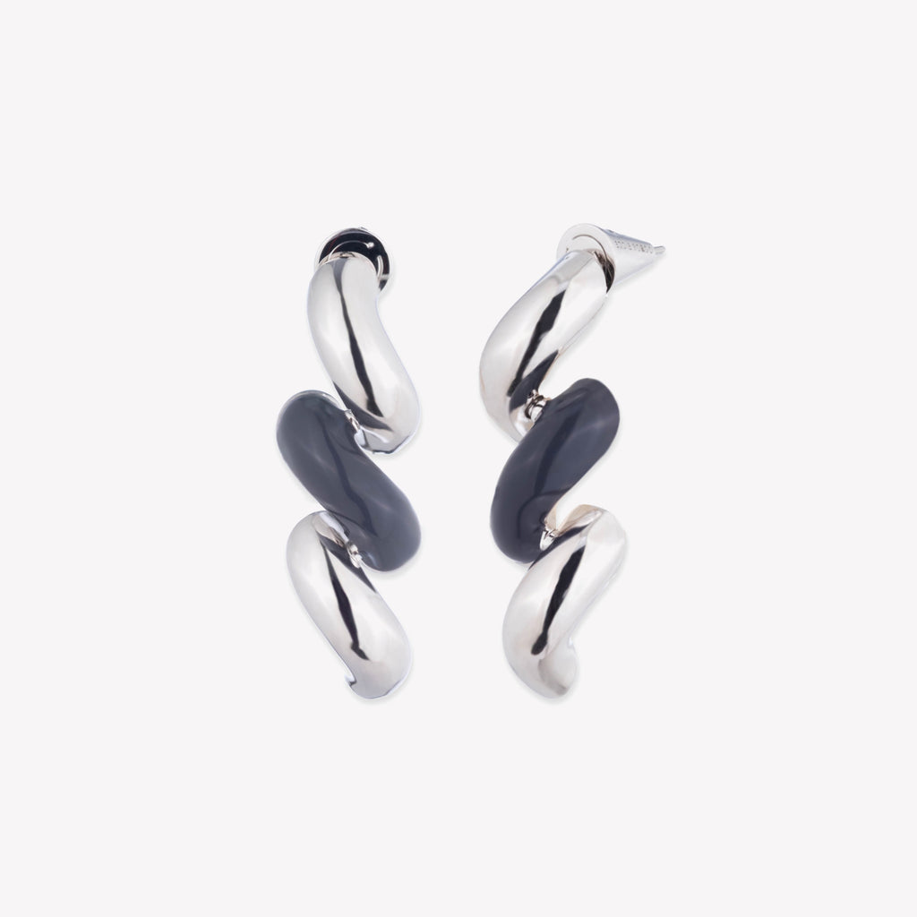 The Cloisonné Torsade Drop Earrings, finished in Silver, are composed of three San Marco links; in a combination of silver and hand applied cloisonné enamel in a midnight blue. This elegant, repeated s-curve shape is lightweight and wearable throughout the day. Surgical steel posts, for pierced ears. Secure with a custom Eddie Borgo earring backing.