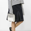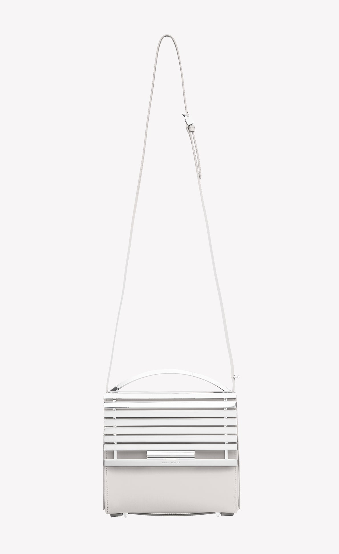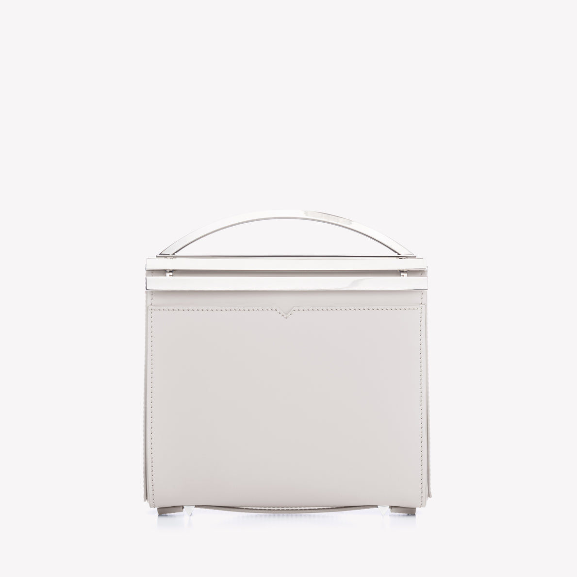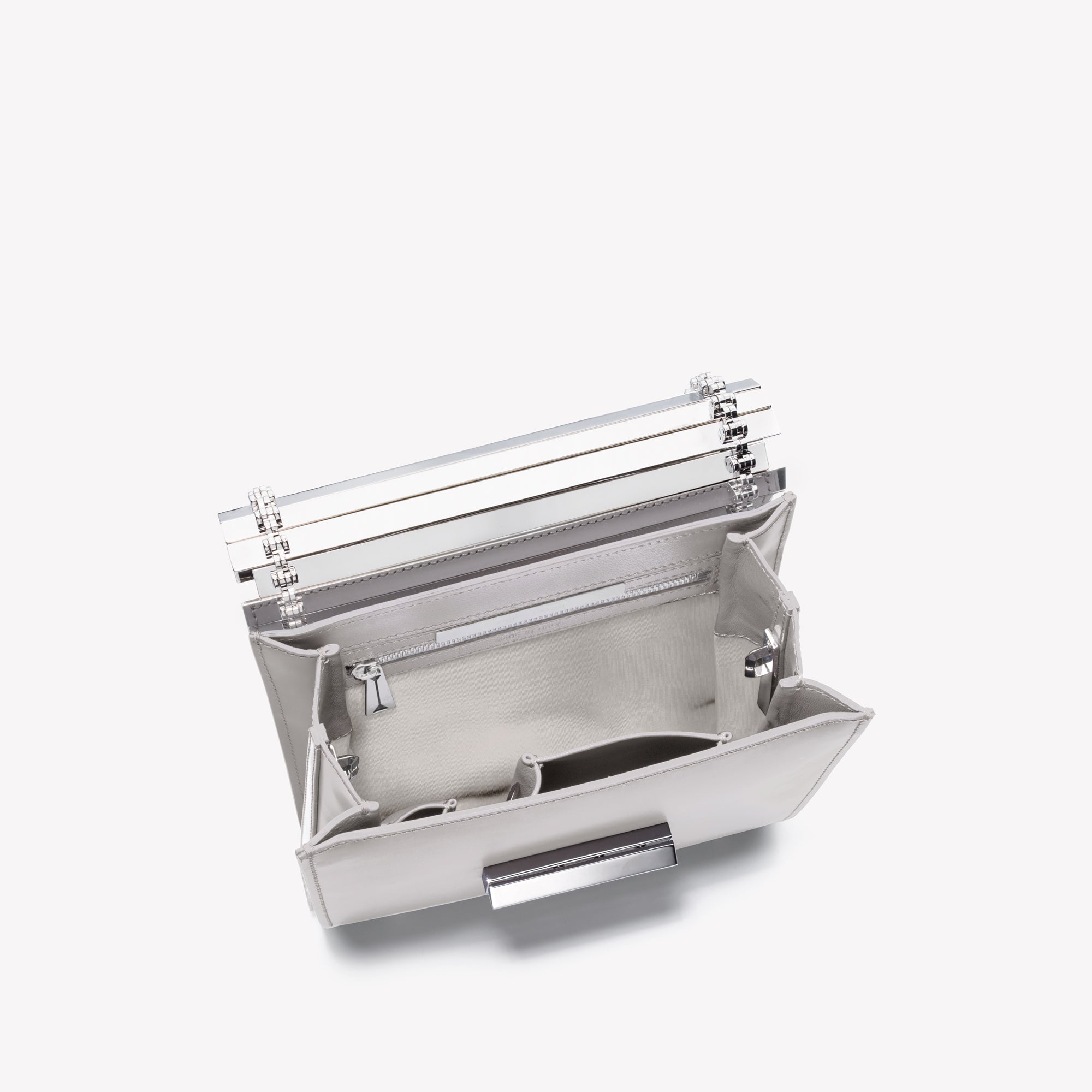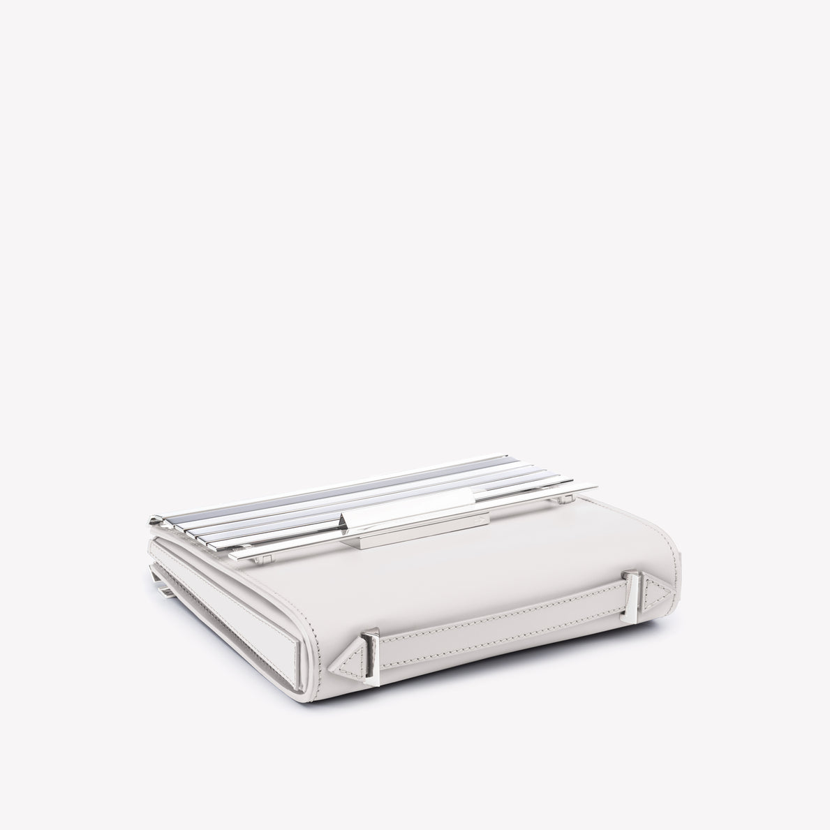 The Colt Crossbody in Matte White Calfskin features an architectural, expandable body and a geometric Sterling Silver vermeiled fold over flap with top handle. This inimitable handbag has been created by hand, in Italy, and opened by gently pushing down on the central crossbar. Inside, there are slip pockets for your cellphone and lipstick, as well as a zipper pocket.