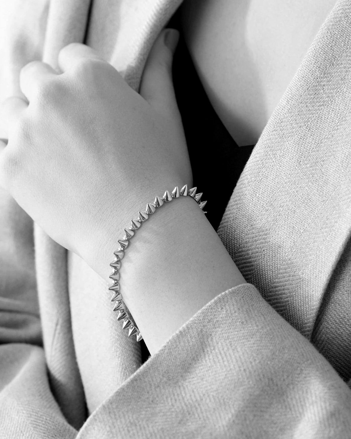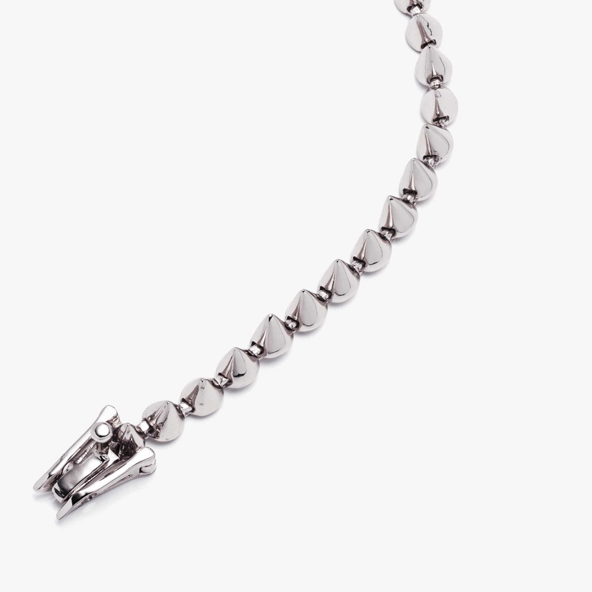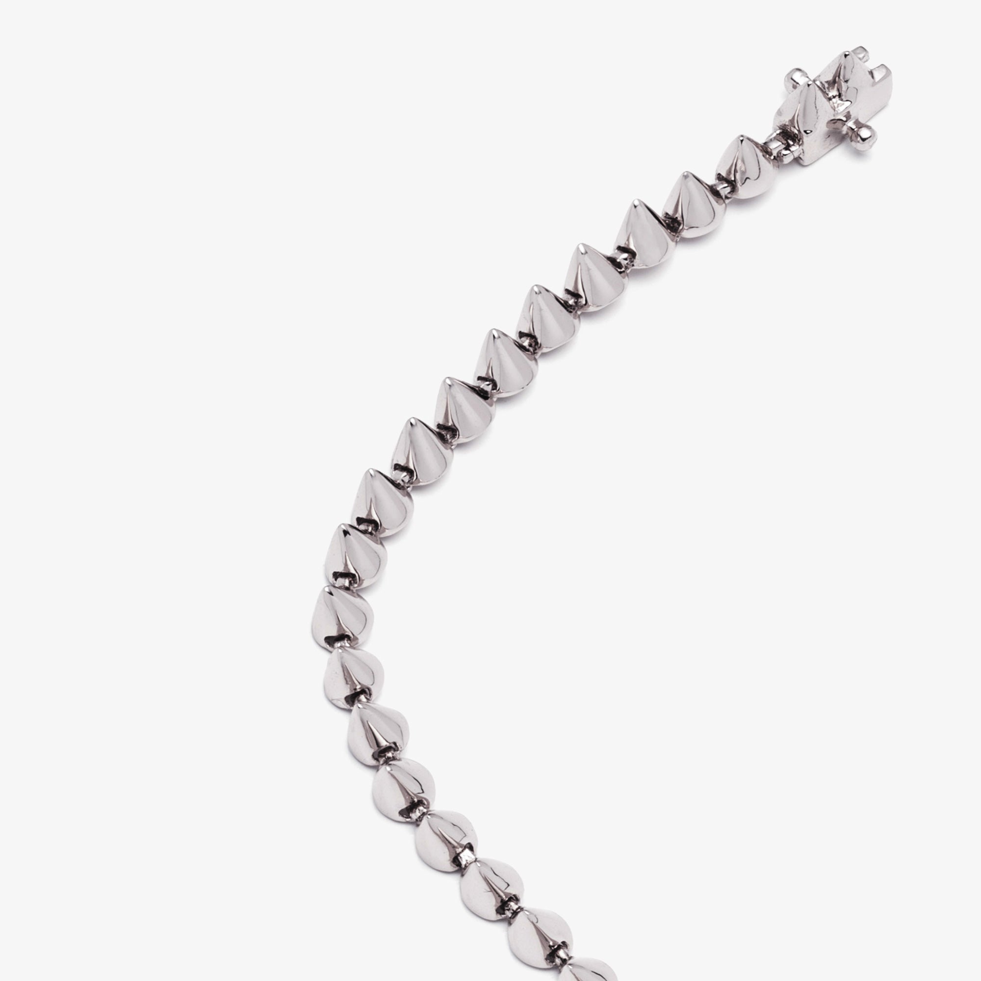 The Cone Tennis Bracelet, finished in silver, is our signature tennis bracelet, composed of delicate cone shapes joined together by hand with individual hinges. A signature Eddie Borgo piece, wear the cone tennis bracelet alone or alongside your other cone bracelets. Close with a box and tongue clasp and secure with two safety latches.