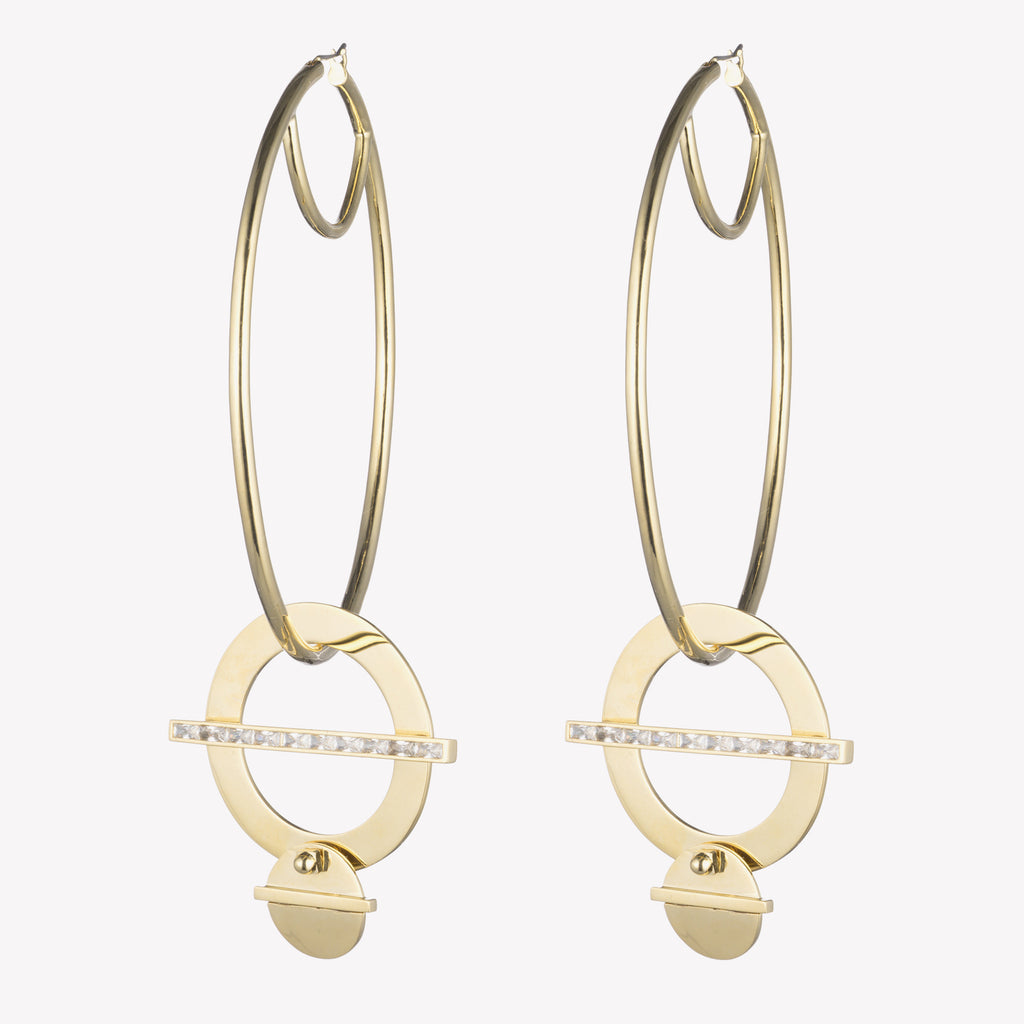 THE CROSSBAR HOOP EARRINGS, finished IN 12 KARAT GOLD, HAVE BEEN CREATED FROM A TRIO OF INTERLINKED HAND FORGED HOOPS AND DISCS. A DELICATE PAVÉ BAGUETTE CROSSBAR RUNS THROUGH THE CENTER RING OF EACH PIECE, ADDING SUBTLE SPARKLE. SURGICAL STEEL POST, FOR PIERCED EARS.