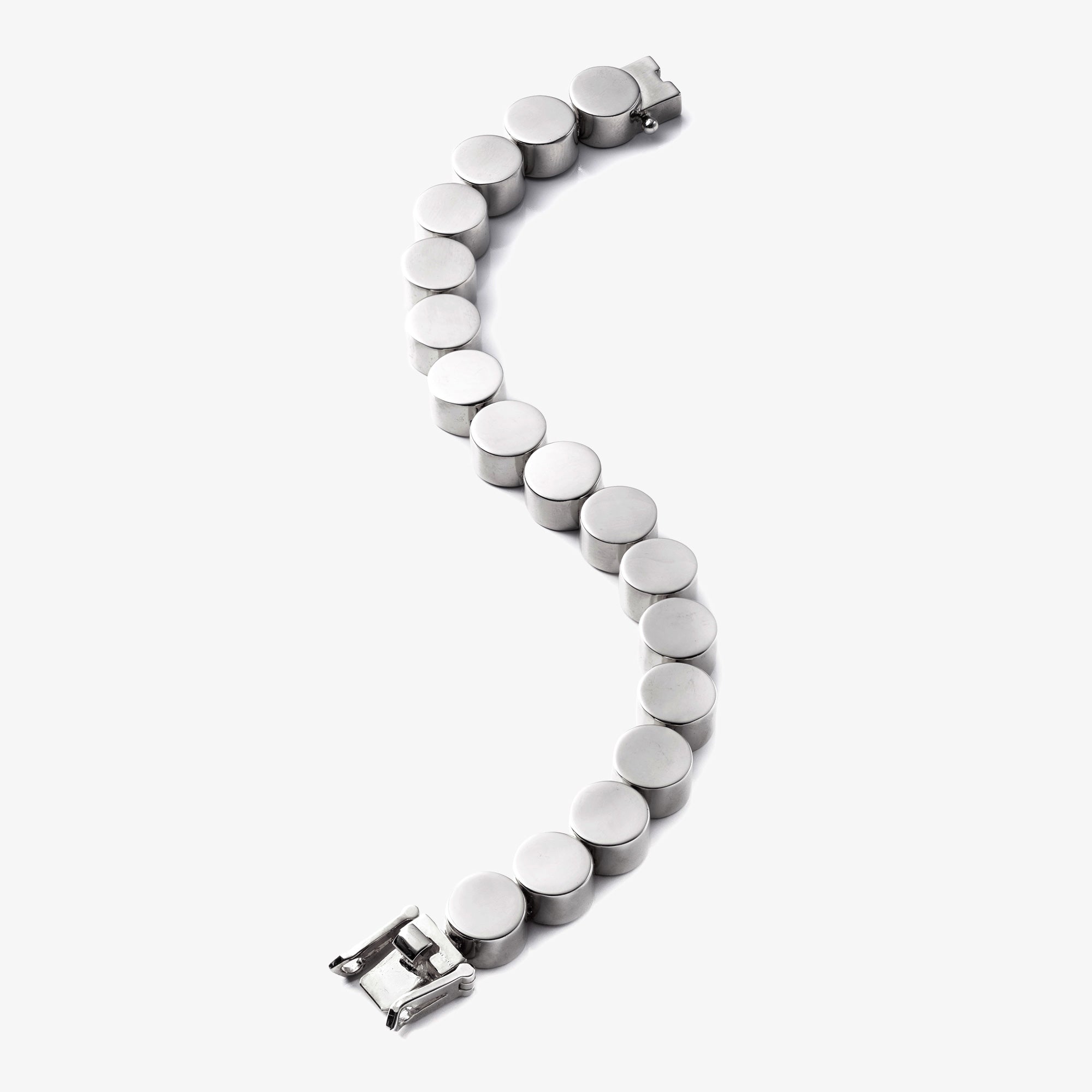 OUR CLASSIC CYLINDER BRACELET, finished IN SILVER, IS COMPOSED OF HAND CARVED AND POLISHED CYLINDERS, EACH LINKED TOGETHER BY HAND TO CREATE OUR SIGNATURE LINK MOVEMENT. WEAR ALONE, LAYER THIS PIECE WITH YOUR OTHER SILVER BRACELETS AND/OR WEAR ALONGSIDE YOUR TIMEPIECE. CLOSES WITH A CUSTOM EDDIE BORGO BOX CLOSURE, SECURES WITH A DOUBLE SAFETY LATCH.
