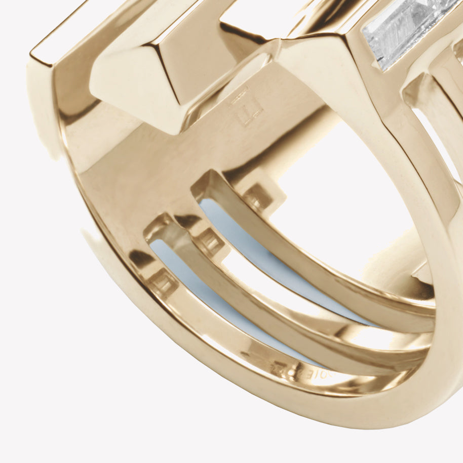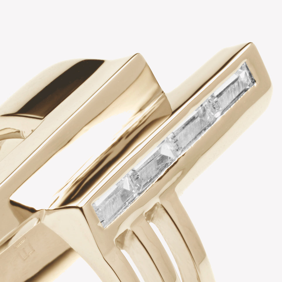 The Division Ring, finished in 12 karat gold, is an architectural ring, created by hand from formed faceted bars and punctuated silver. Delicate pavé baguette crystal has been carefully inlaid into the front of this ring for subtle sparkle.