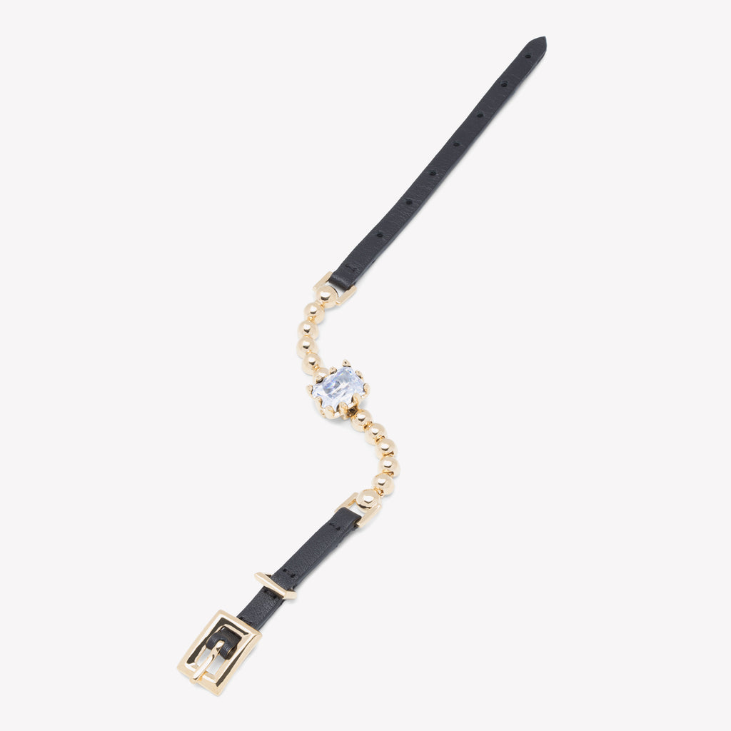 The Estate Strap Bracelet COMBINES THE FLUIDITY OF OR CLASSIC DOME TENNIS BRACELET WITH A CLEAN BLACK LEATHER STRAP. A CENTRAL, EMERALD CUT CRYSTAL HAS BEEN STEP CUT AND SET IN OUR CUSTOM PRONGS. FINISHED IN 12 Karat Gold. CLOSES WITH AN ADJUSTABLE LEATHER STRAP AND BUCKLE CLOSURE.