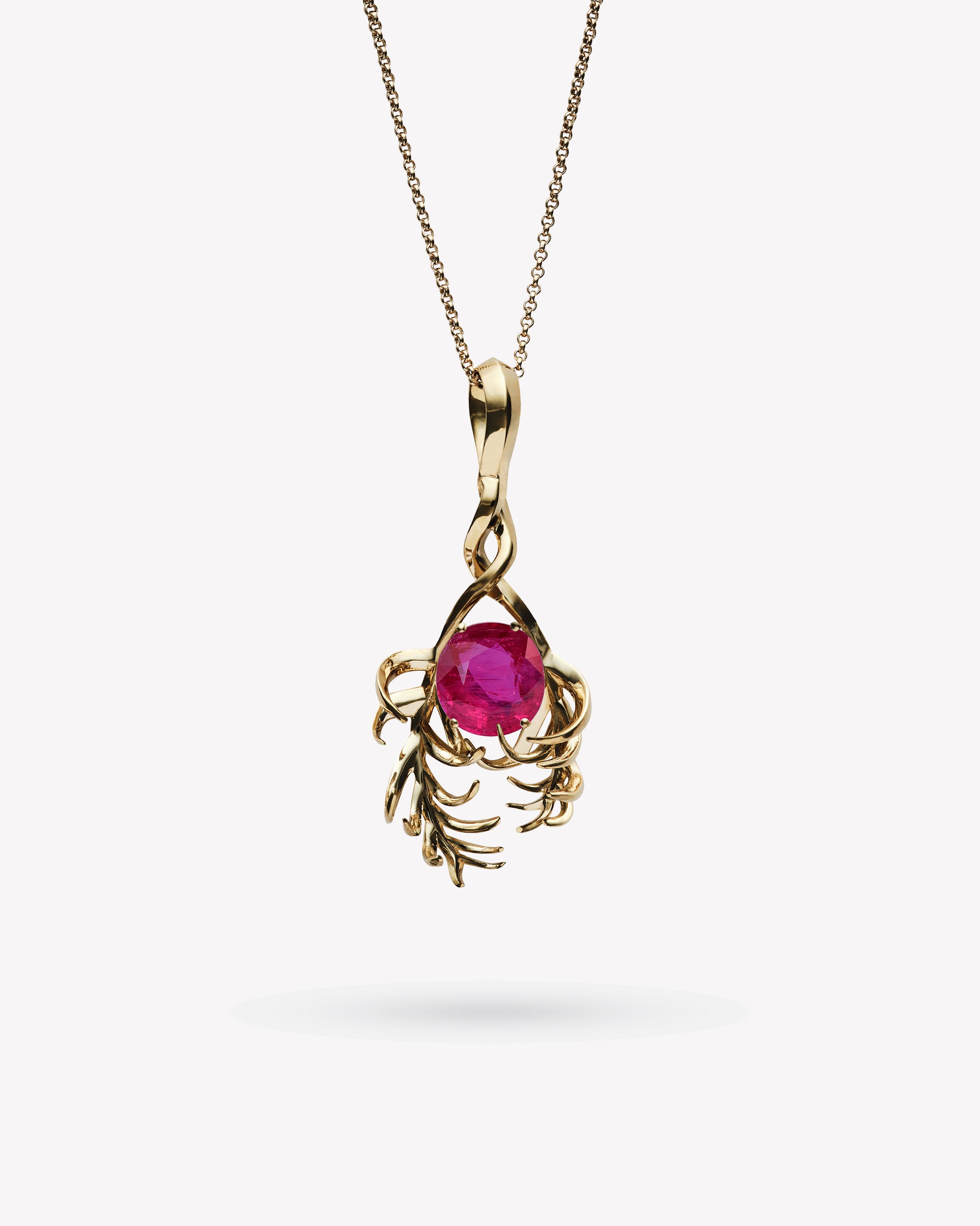 the creation of each piece is done entirely by hand, each delicate frond begins as a flat object, each leaf then carefully formed to establish life and movement. as a result, no two pieces are the same, each frond sculpted into a unique object in and of itself, each rare stone the only of its kind.