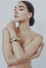 The Inlaid Cabochon Dome Bracelet, finished in 12 karat gold, is a classic, hinged oval cuff bracelet. This inimitable piece has been inlaid with fourteen hand carved, domed cabochons of genuine Onyx, Jade, Jasper, Tiger Eye, Red Agate and Dalmatian Jasper.. This bracelet has been created and by hand, the interior entirely caged for comfort. Opens with a custom push closure at one side.