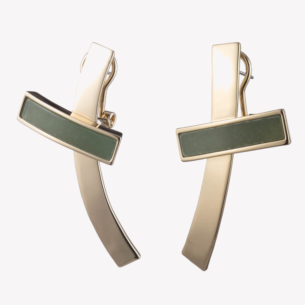 The Inlaid Crossbar Earrings, finished in 12 Karat Gold, are classic, oversized drop earrings; lightweight and offset with a hand cut, genuine Jade crossbar. A custom omega clip backing secures to the ear. Surgical steel posts, for pierced ears.