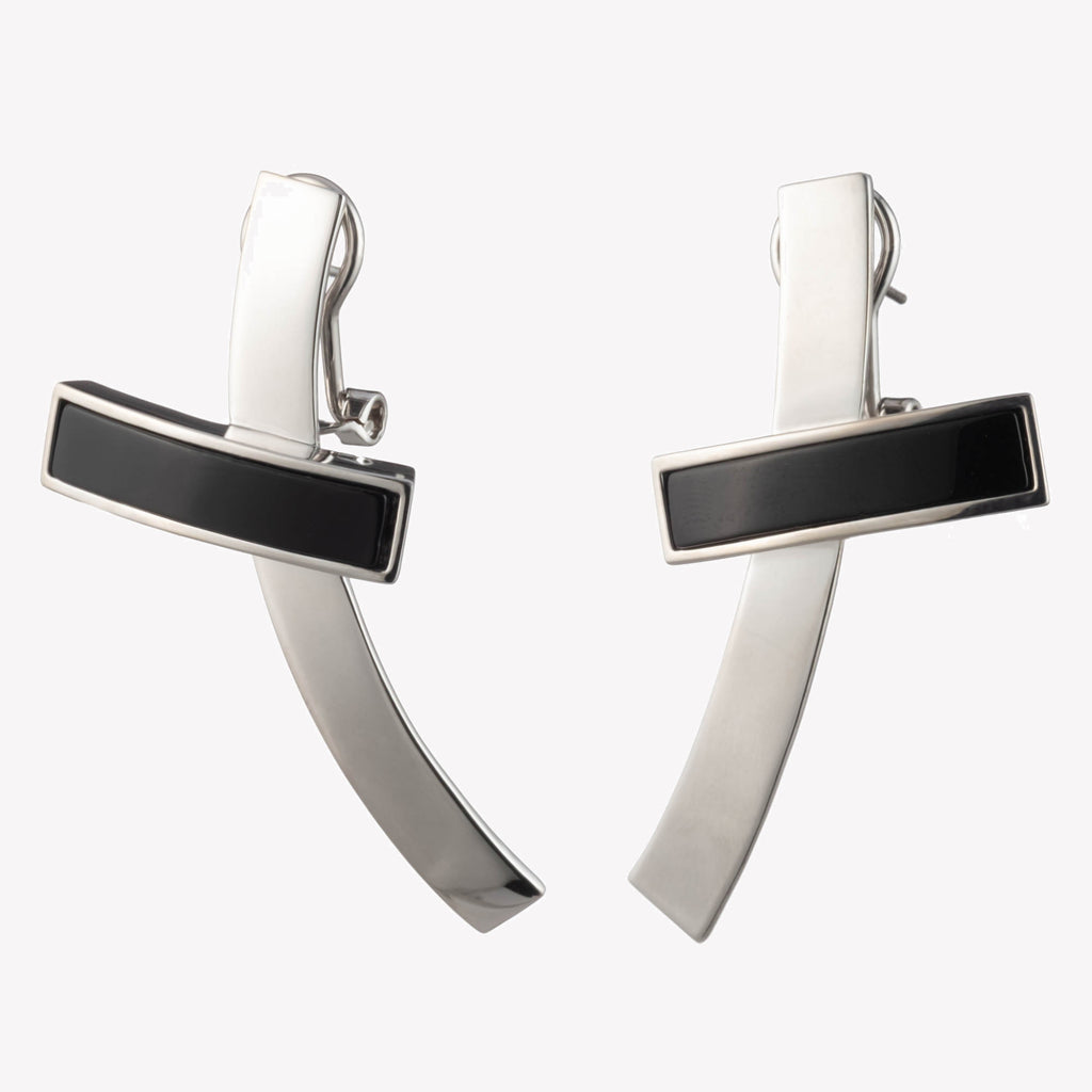 The Inlaid Crossbar Earrings, finished in silver, are classic, oversized drop earrings; lightweight and offset with a hand cut, genuine onyx crossbar. A custom omega clip backing secures to the ear. Surgical steel posts, for pierced ears.