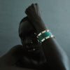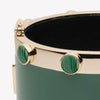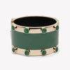 The Inlaid Cabochon Cuff, finished in 12 Karat Gold, is a wide bracelet that has been inlaid by hand with emerald green cloisonné enamel and accented with sixteen genuine Malachite cabochons. The interior is lined in black calf skin. Open with a custom push closure at one side and secure with a safety latch.