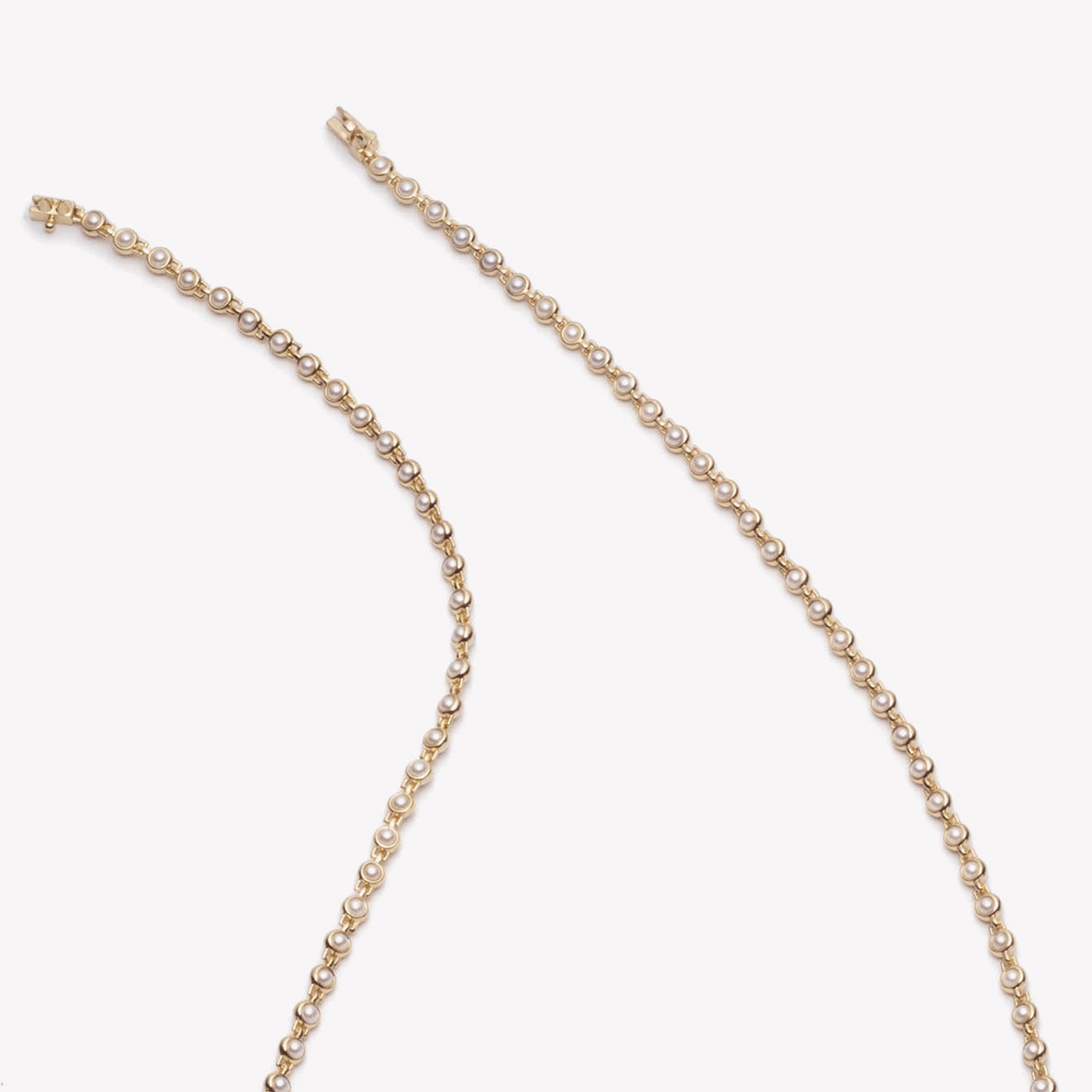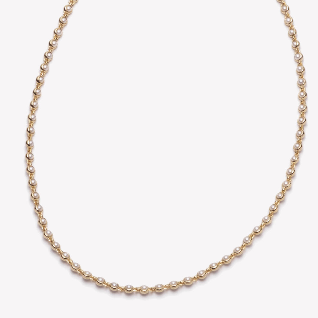The inlaid pearl necklace, finished in 12 karat gold, is a classic link necklace, composed of individually channel set cabochons of freshwater pearls. Intricately linked together with our trademark hinge work, each piece contains over 250 hand set pearls. Close at the back with a custom box closure and secure with a safety latch.