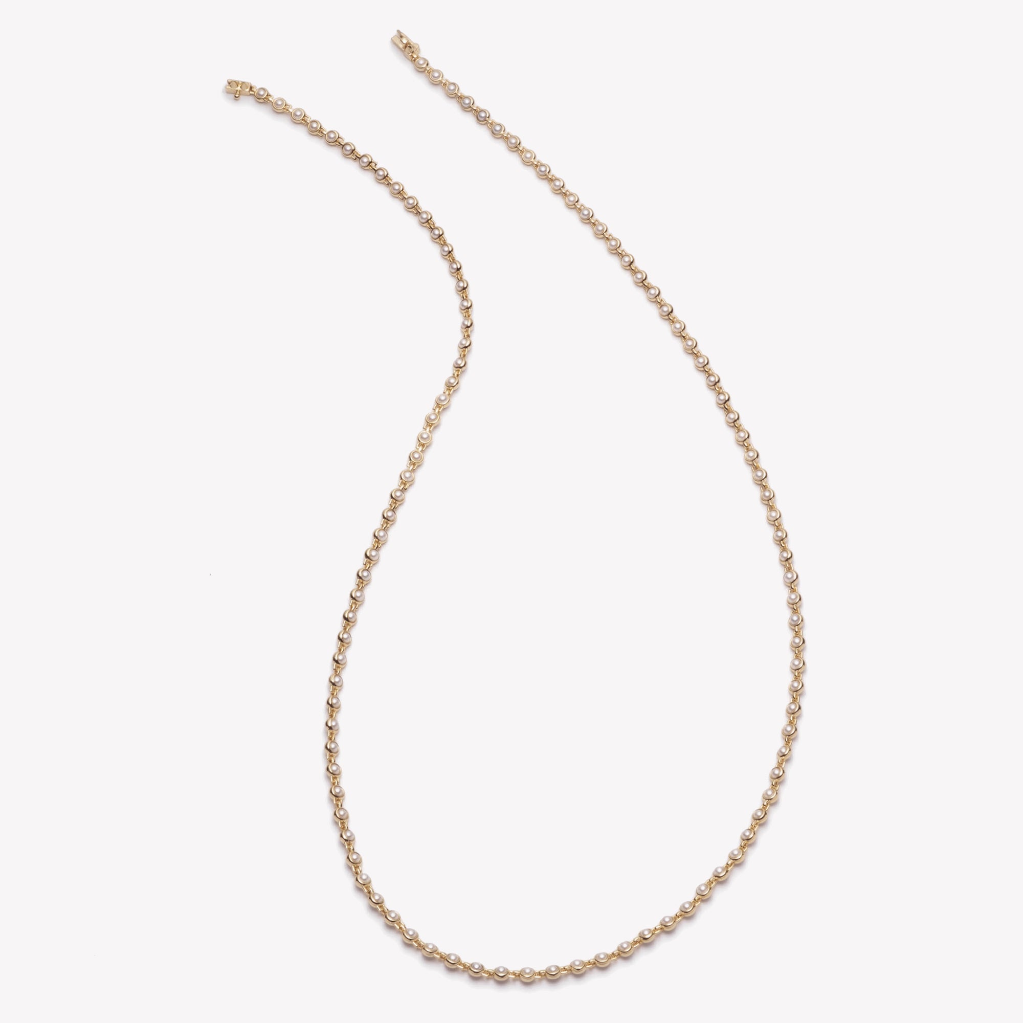 The inlaid pearl necklace, finished in 12 karat gold, is a classic link necklace, composed of individually channel set cabochons of freshwater pearls. Intricately linked together with our trademark hinge work, each piece contains over 250 hand set pearls. Close at the back with a custom box closure and secure with a safety latch.