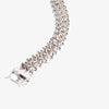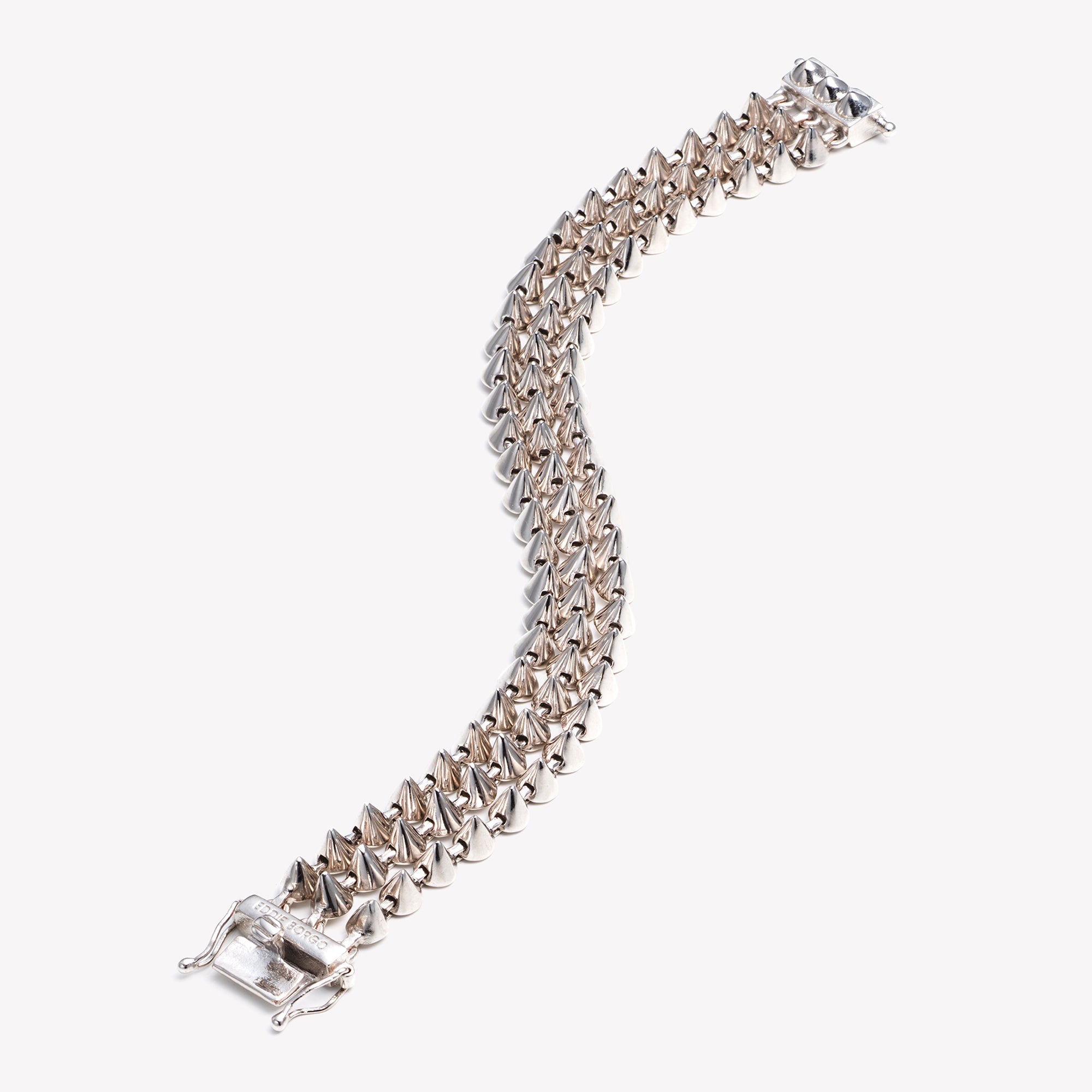 The three strand cone tennis bracelet, finished in silver, is our signature tennis bracelet, composed of delicate cone shapes joined together by hand with individual hinges. A signature Eddie Borgo piece, wear the three strand cone tennis bracelet alone or alongside your other Eddie Borgo cone bracelets. Closes with a box and tongue clasp and secure with two safety latches.
