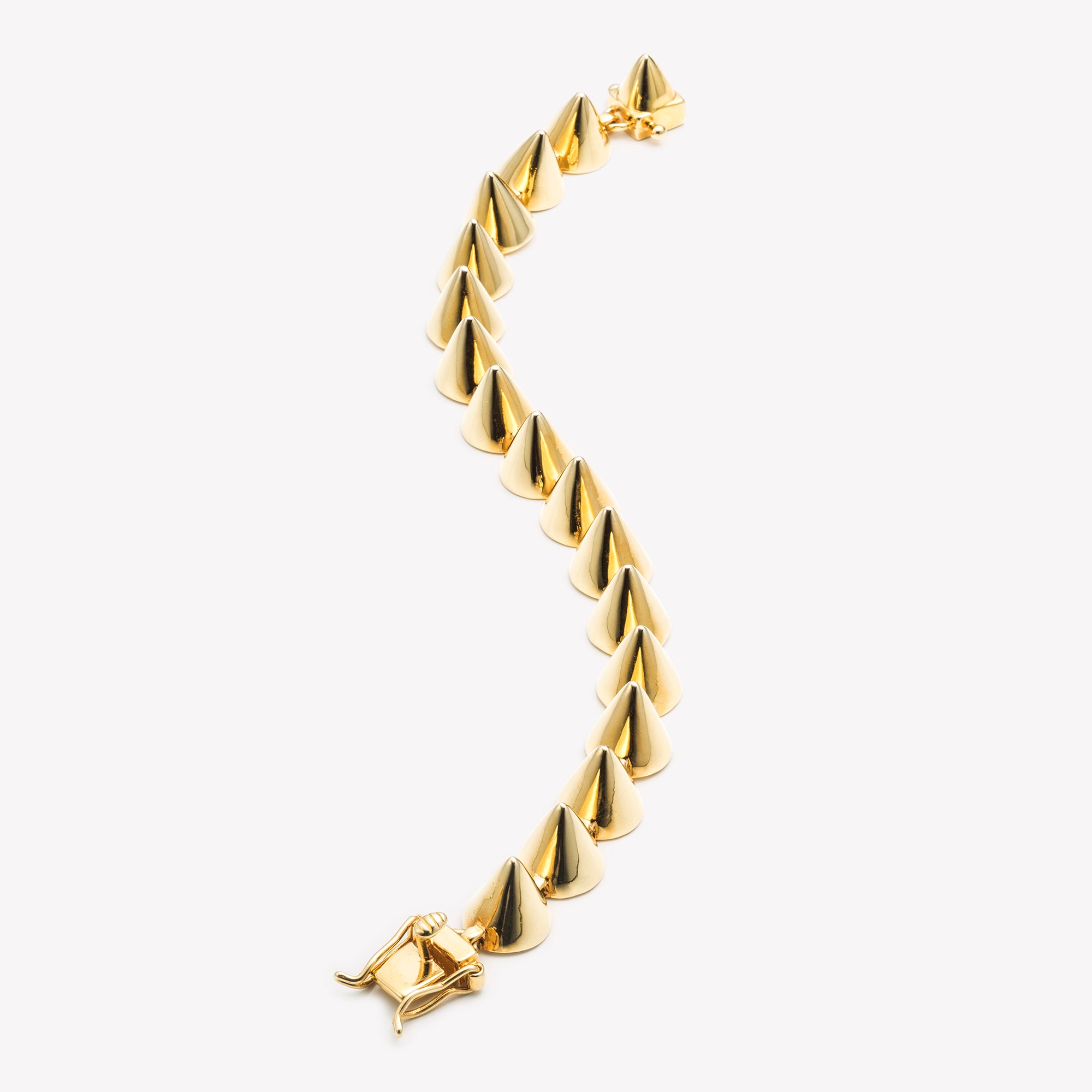 Our classic Cone Bracelet, shown here finished in 12 Karat Gold. This inimitable piece has been created with our trademark hinge work for a comfortable fit. Wear alongside your timepiece. Closes with a custom box and tongue closure and secures with two safety latches.