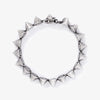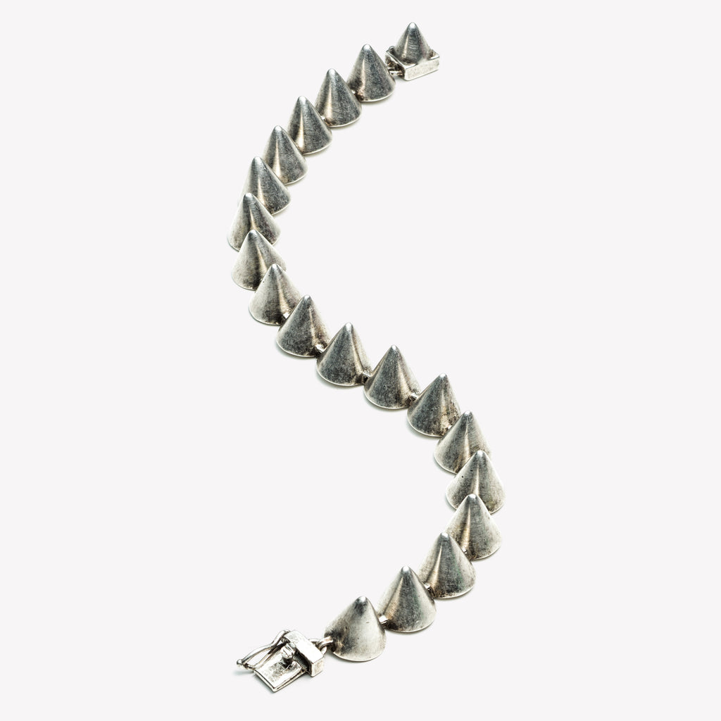 The Cone Bracelet in oxidized Sterling Silver is our signature cone bracelet, composed of cone shapes joined together by hand with individual hinges. A classic Eddie Borgo piece, wear the cone bracelet alone or alongside your timepiece. Close with a box and tongue clasp and secure with a safety latch.