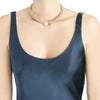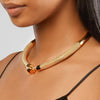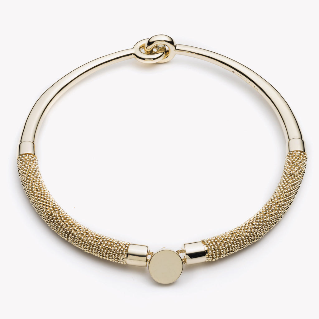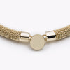 The Orissa Torque Collar, finished in 12 Karat Gold, is a hand beaded, hinged collar that easily opens with a button closure at the front. The beading of delicate golden orbs, each wired onto the necklace by hand, takes three days to complete.
