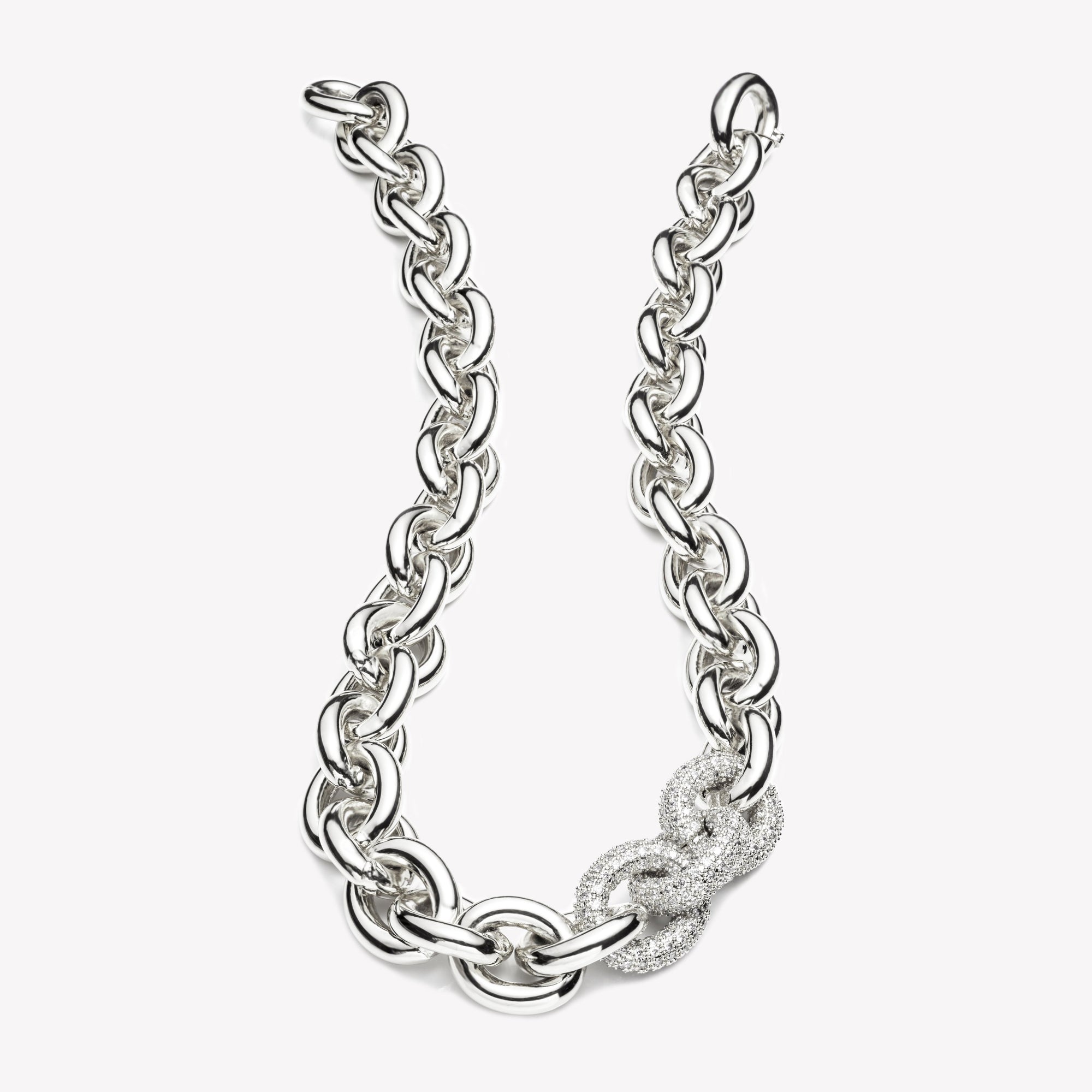 The Pavé Cable Link Necklace, finished in silver, is a classic Eddie Borgo chain link necklace. Three offset links have been hand set in crystal pavé for subtle sparkle. A custom link closure and safety latch secure this necklace closed.