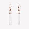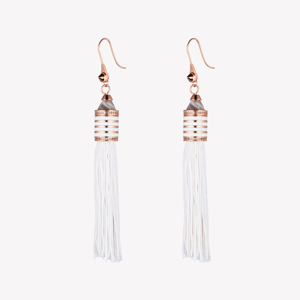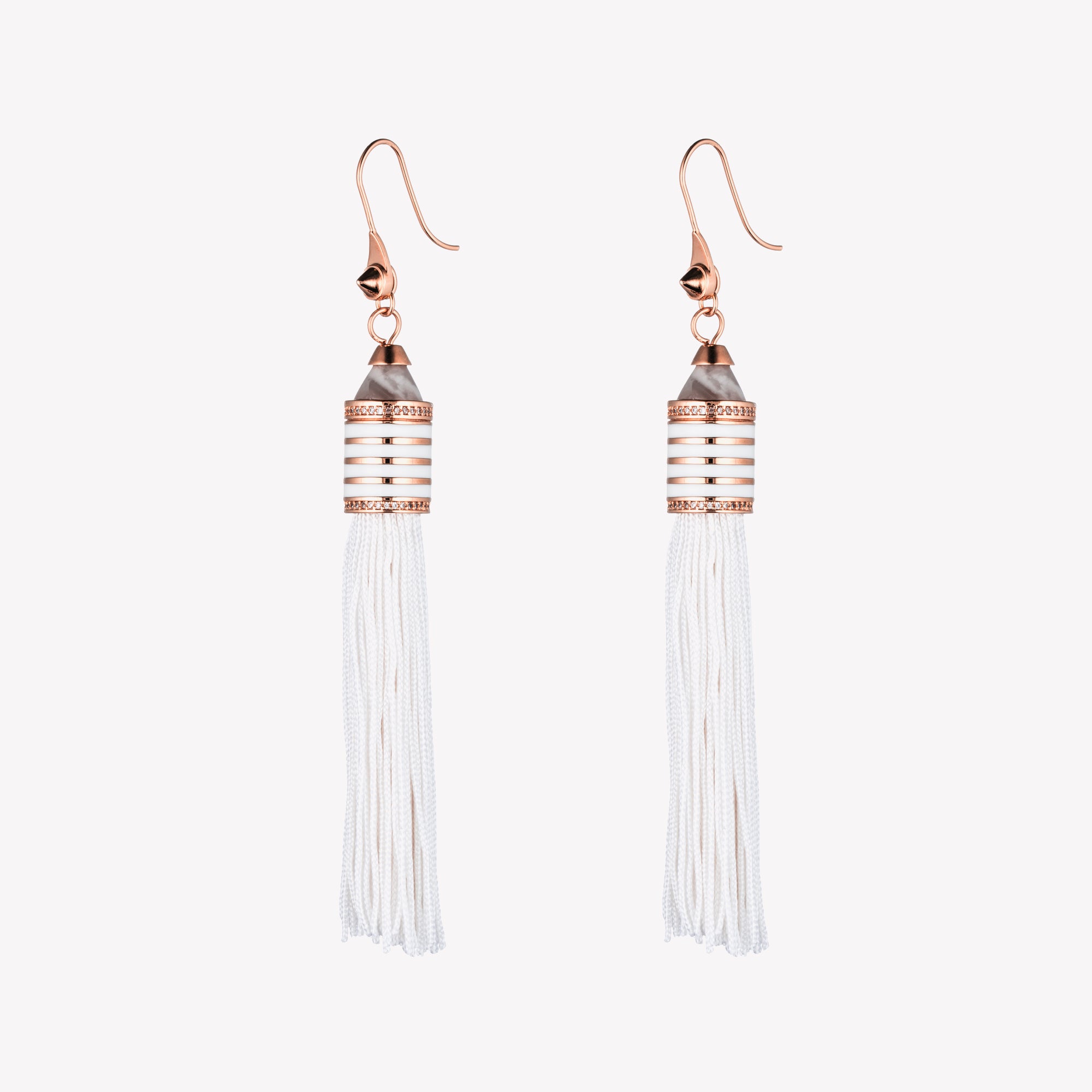 THE PAVÉ Enamel Tassel Earrings, finished in 12 KARAT ROSE GOLD, HAVE BEEN CREATED FROM A GROUND ENAMELED CAP, INALID WITH A HAND CUT white lace agate STONE. BANDS OF HAND SET PAVÉ SURROUND THE CAP AT BOTH THE TOP AND BOTTOM, FOR SUBTLE SPARKLE. THE SILK TASSEL IS COMPOSED OF WHITE MOROCCAN SILK, HAND THREADED INTO THE CAP. EAR WIRE, FOR PIERCED EARS.
