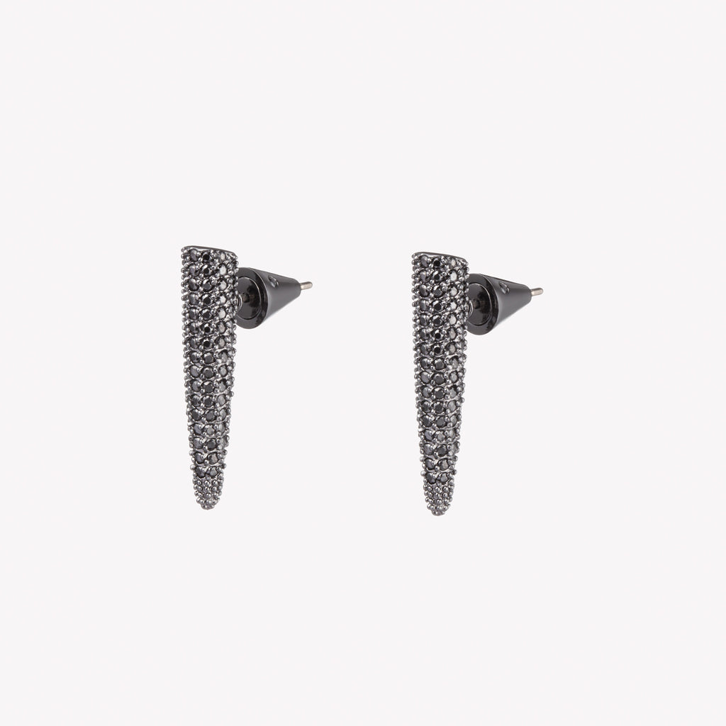 THE PAVÉ SPIKE STUD EARRINGS, finished IN BLACKENED SILVER, ARE A LINEAR SHORT ROD EARRING, CREATED FROM A DELICATE BAR THAT HAS BEEN INTRICATELY HAND SET WITH PAVÉ ONYX. A MINIMAL ALTERNATIVE FOR AN EVENING OUT. SECURE ONTO THE EAR WITH A CUSTOM EDDIE BORGO EARRING BACKING. SURGICAL STEEL POST, FOR PIERCED EARS.
