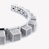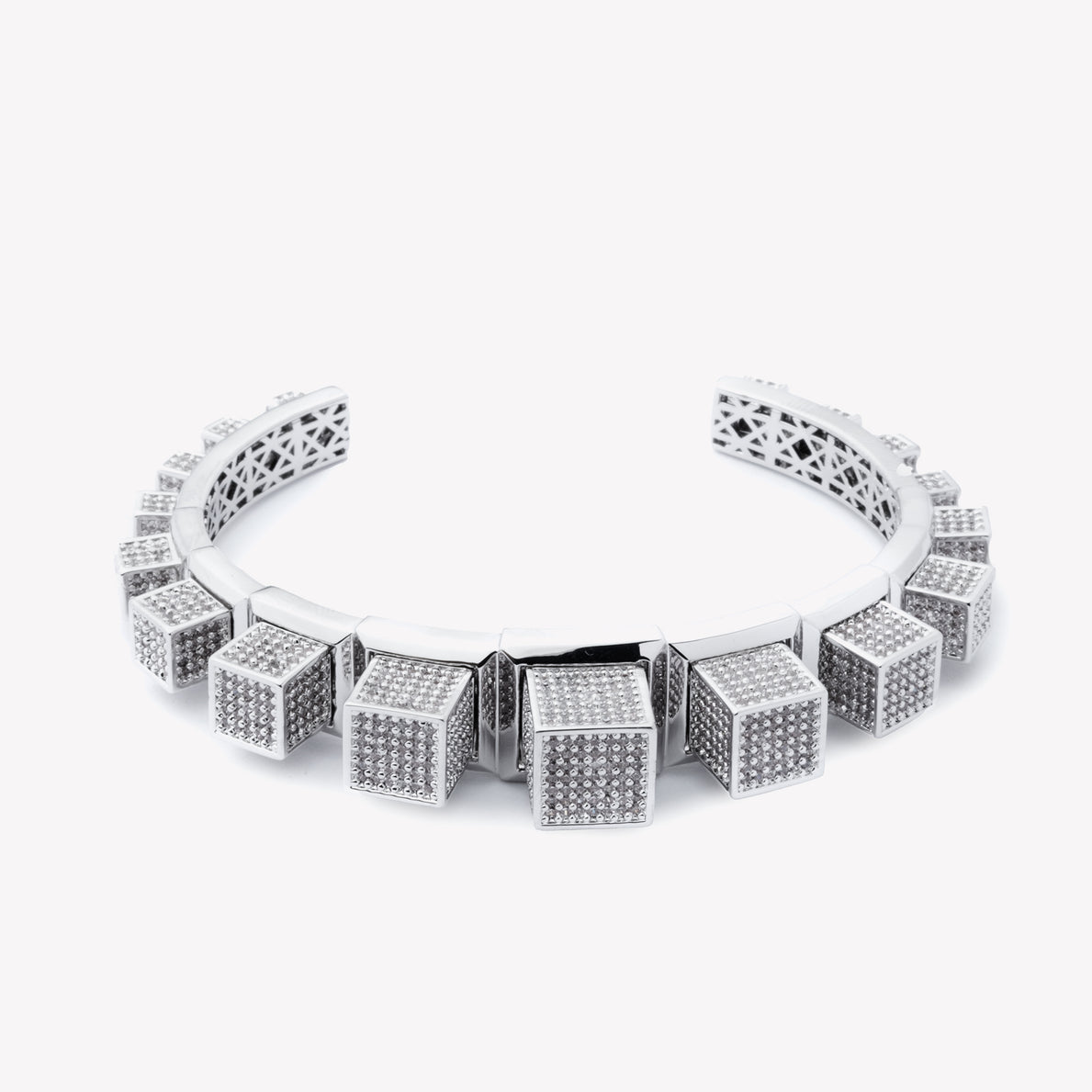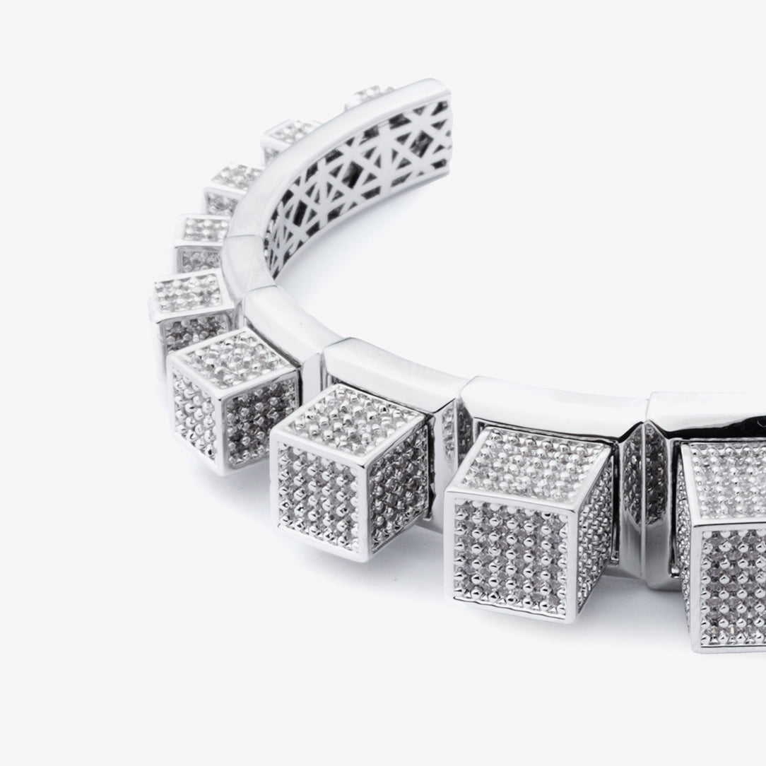 The Pavé Graduated Cube Cuff, finished in Silver, has been created from graduated bezel settings that are each carefully hand set with pavé crystal. This unique cuff bracelet has been finished at the back with a cage for comfort. Open back, easily slips onto the wrist.