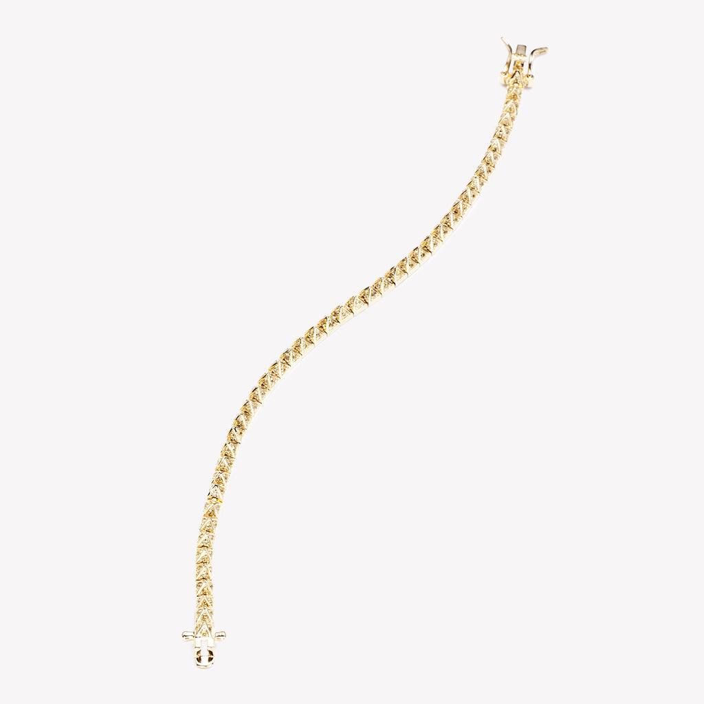 The Pavé Pyramid Tennis Bracelet, finished in 12 Karat Gold, is our signature tennis bracelet, composed of delicate pyramid shapes joined together by hand with individual hinges and prong set with pavé crystal. A signature Eddie Borgo piece, wear the pyramid tennis bracelet alone or alongside your other pyramid bracelets. Close with a box and tongue clasp and secure with two safety latches.