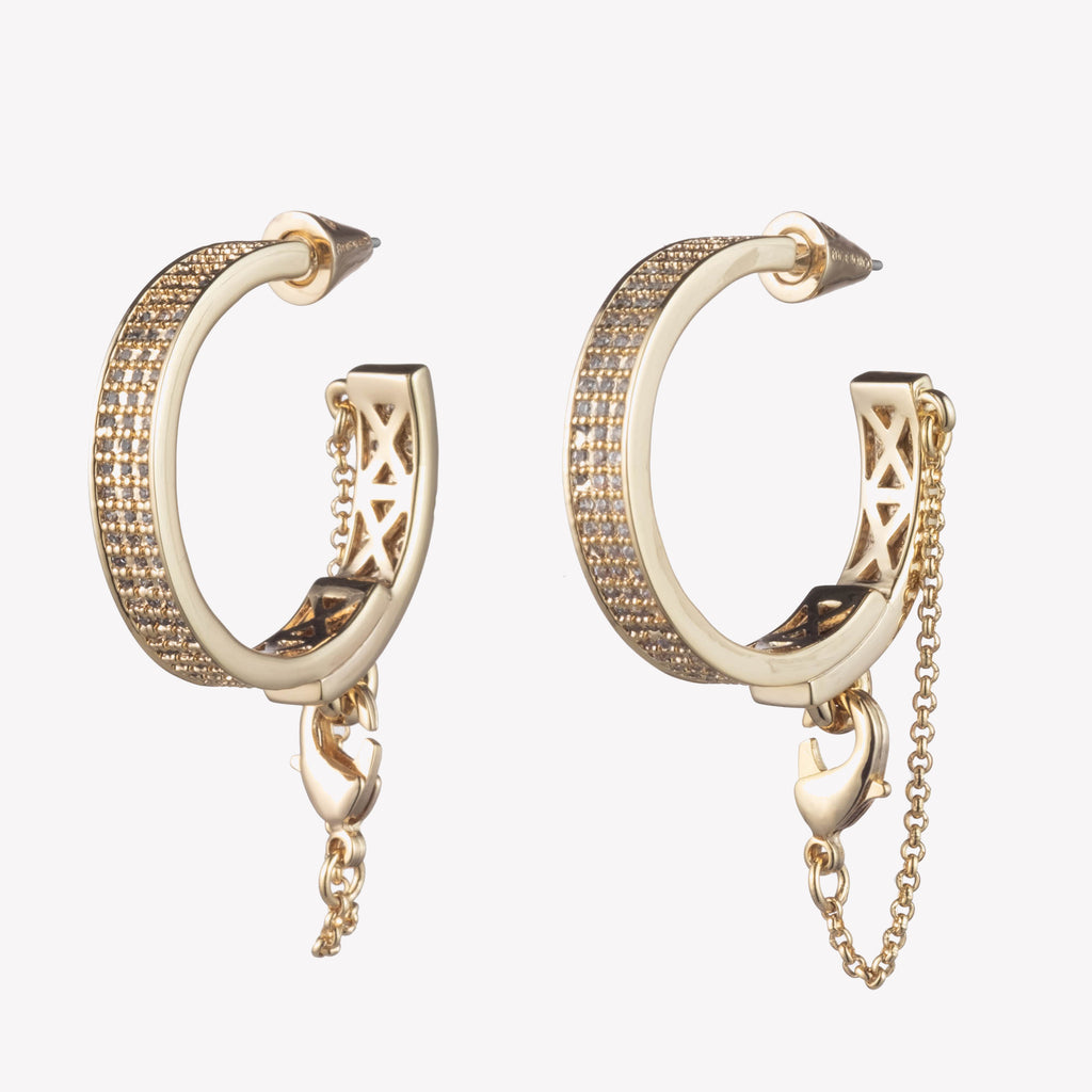 The Pavé Safety Chain Hoop earrings, finished in 12 Karat Gold, are a classic flat hoop style entirely hand set in delicate pavé crystal. Created by hand, these unique earrings were finished as two overlapping bands, fixed into place with a vintage safety chain closure. Secure with a custom Eddie Borgo earring back. Surgical steel posts, for pierced ears.