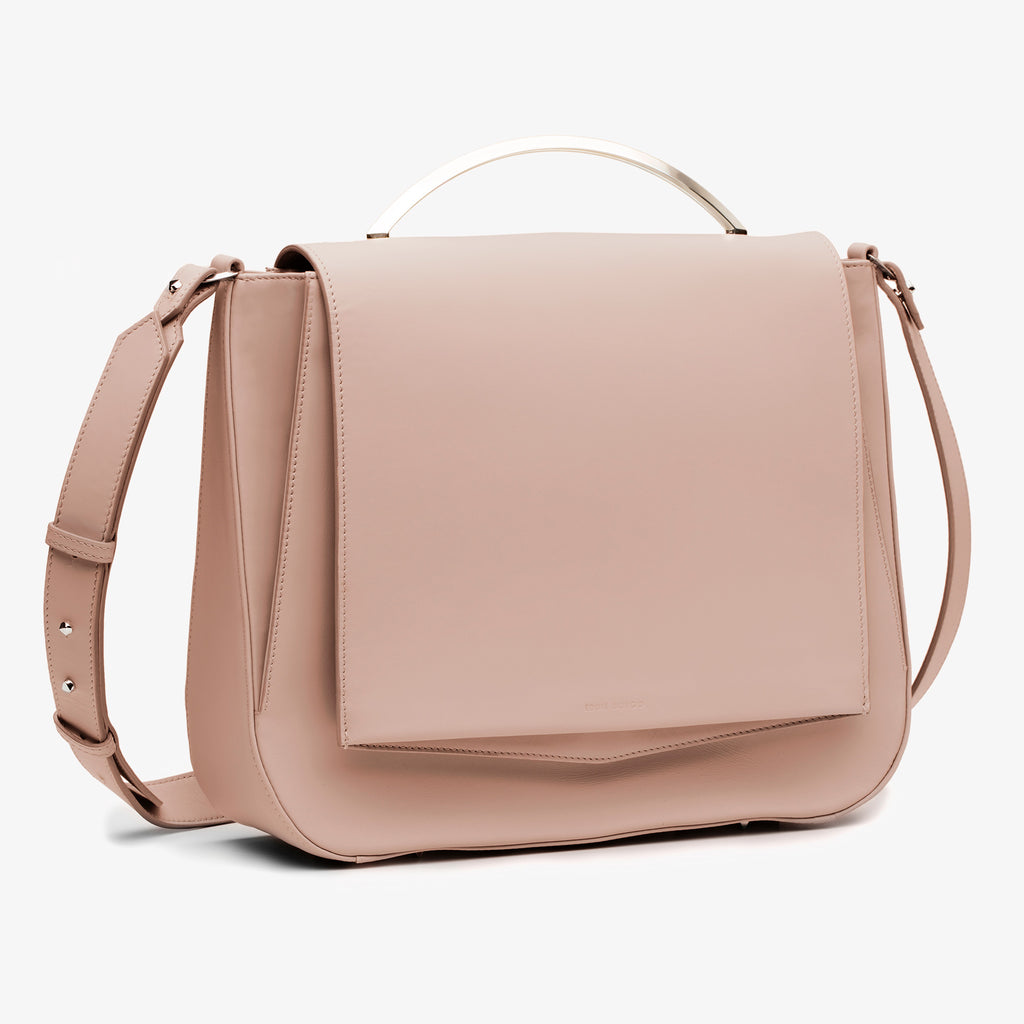 The Pepper Saddle Bag in Blush Pink Calfskin is a classic messenger bag, reimagined with a curved gold top handle and sleek envelope-shaped front. The faille-lined interior is perfectly proportioned to hold just the essentials and has card pockets to eliminate the need for a wallet. Detach the shoulder strap to carry it as a clutch.
