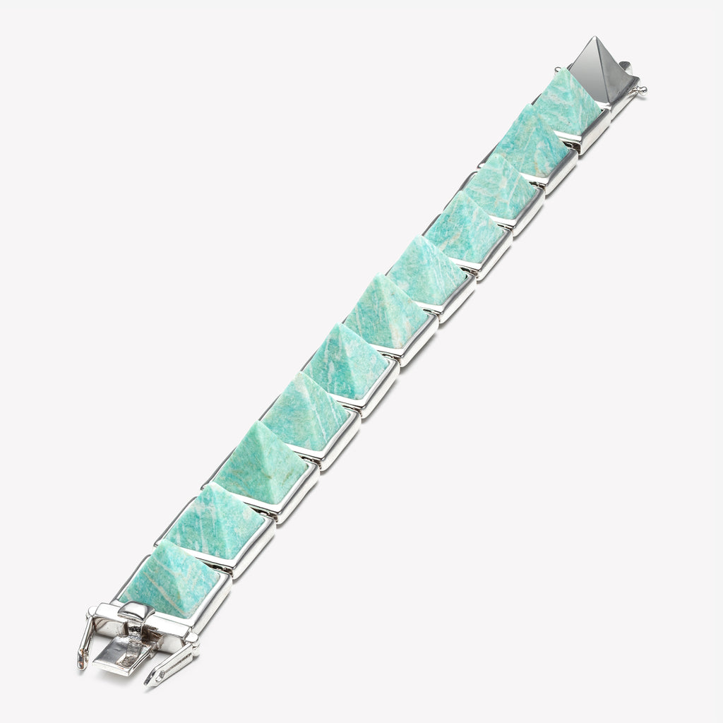 The Classic Pyramid Bracelet, SET WITH HAND CUT AMAZONITE INTO STERLING SILVER VERMEIL BEZEL SETTINGS. THE BRACELET IS BACKED WITH CUSTOM EDDIE BORGO CAGE WORK TO SECURE EACH UNIQUE STONE. CLOSES WITH A BOX CLOSURE AND SECURES WITH A SAFETY LATCH.