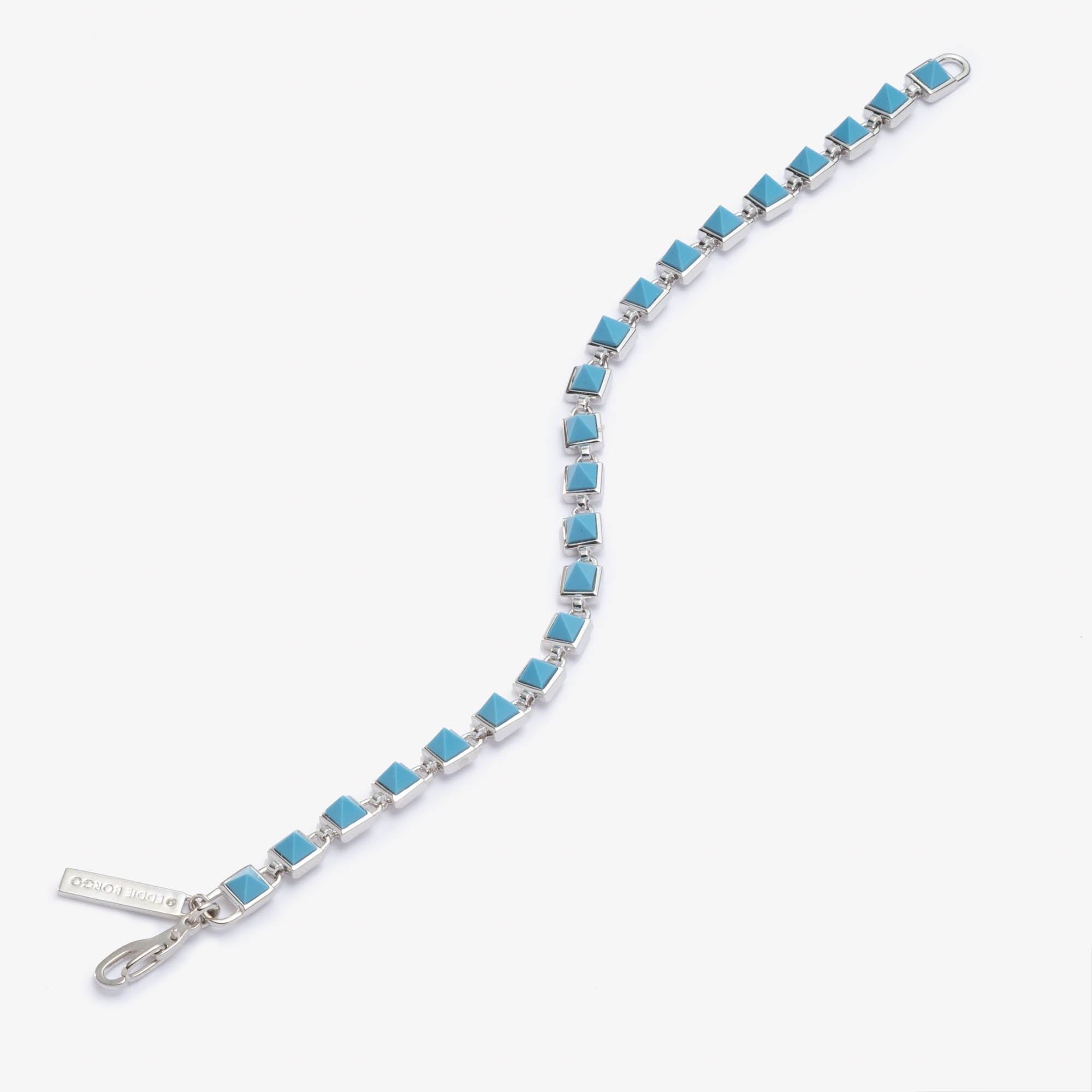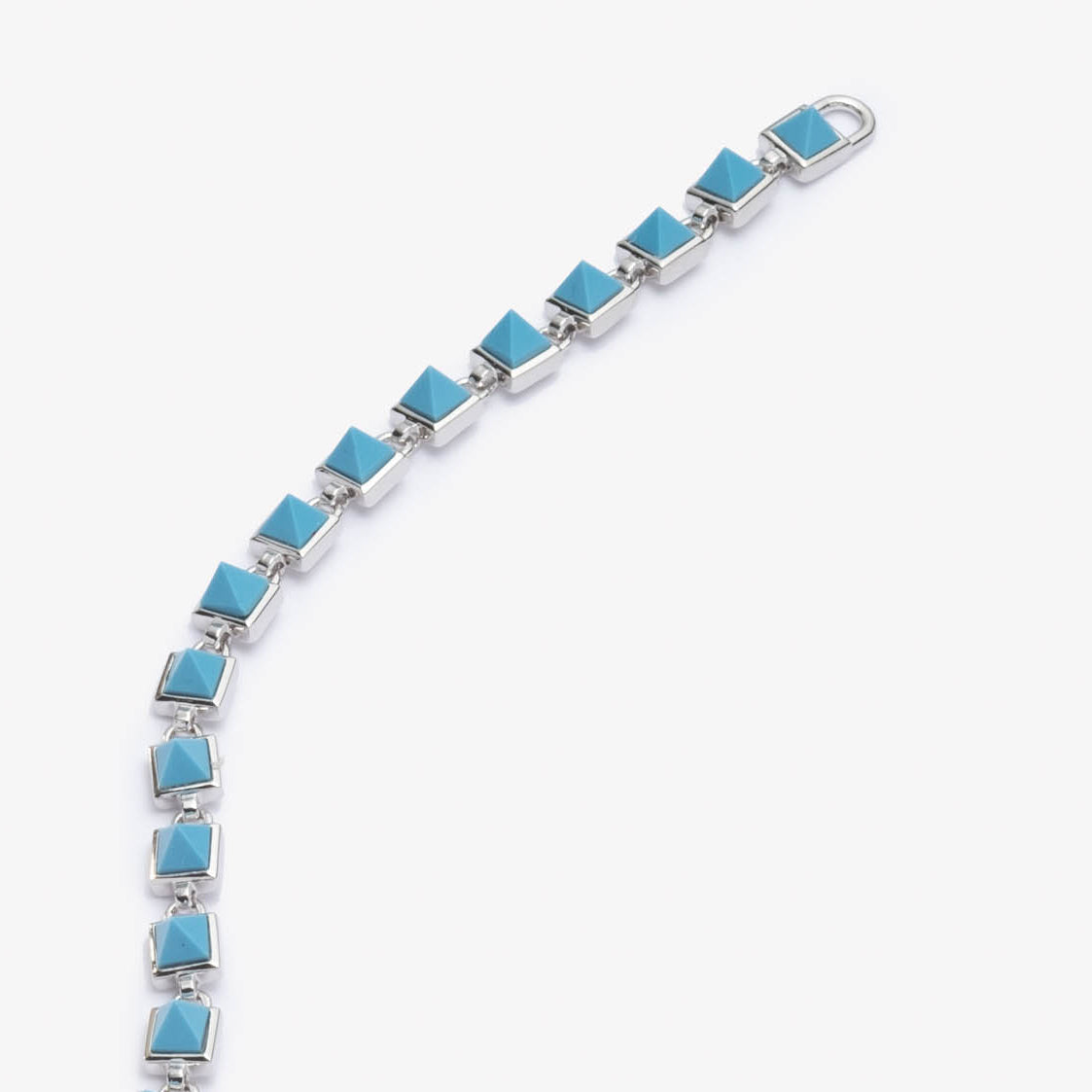 The Pyramid Tennis Bracelet, finished in Silver, is created from delicate, bezel set pyramid shapes, cut by hand in Turquoise. Crafted entirely by hand, this bracelet is hinged for fluidity and comfort. Secure with a custom clip.