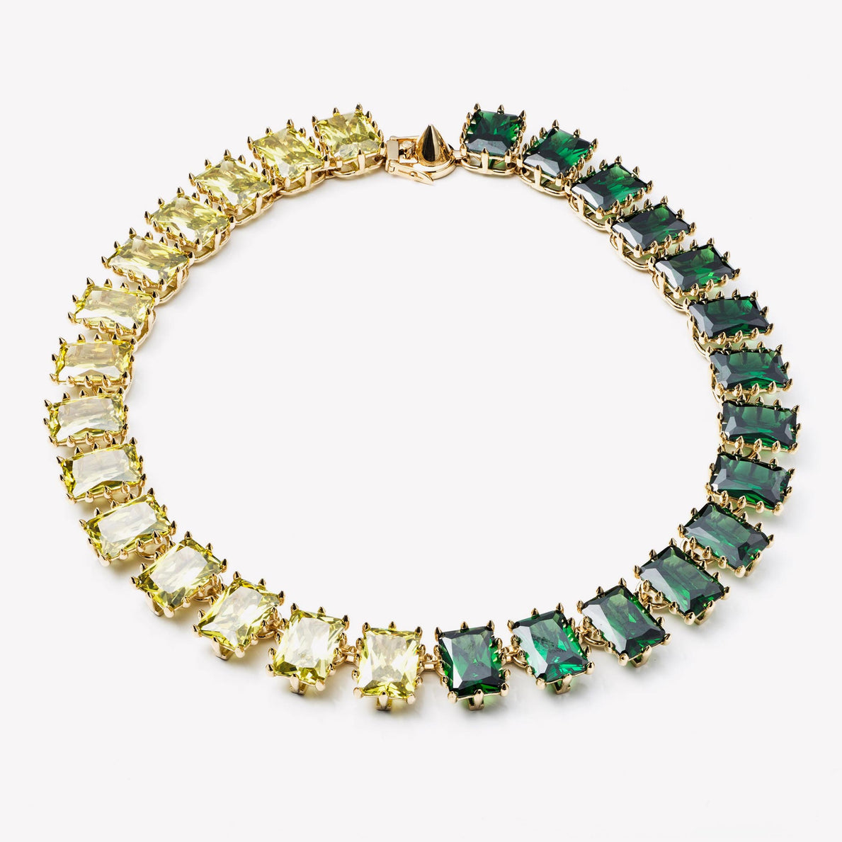 The Rectangle Estate Necklace, finished in 12 Karat Gold, has been entirely bezel set with hand cut citrine and emerald crystal. Each stone has been emerald cut by hand with step-cut facets, for subtle shimmer. Closes with a custom Eddie Borgo closure, secure with a safety latch.
