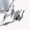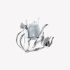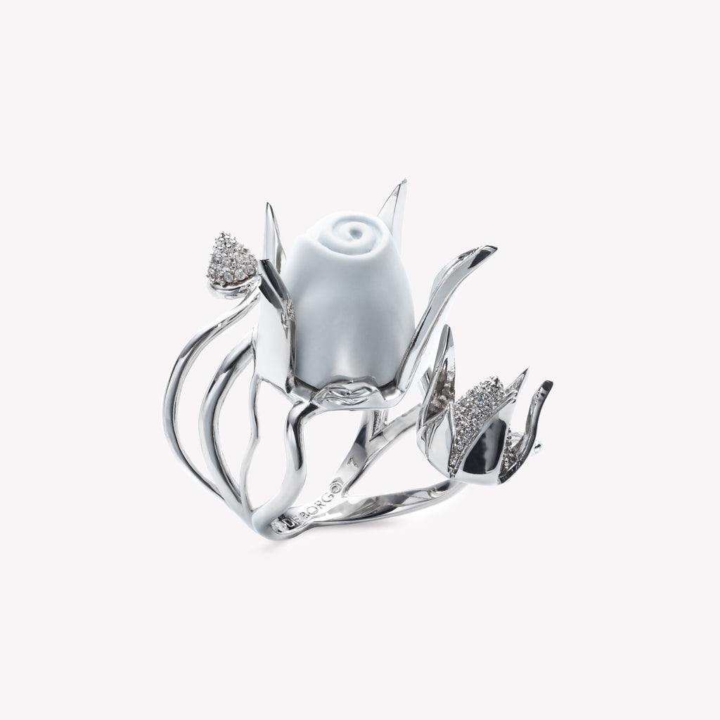 The Climbing Rose Ring finished in silver, is a hand carved ring, sculpted to comfortably sit on the wearer's finger. The ring's center features a lacquered porcelain rose, and pavé rosebuds surrounded by hand carved petals anchor the piece at each side.