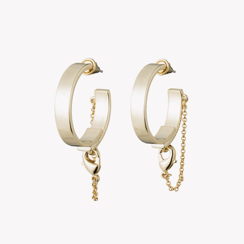 The Safety Chain Hoop Earrings, finished in 12 Karat Gold, give new dimension to a classic flat hoop style by showcasing a delicate curb chain detail. Created by hand, these unique earrings were finished as two overlapping bands, fixed into place with a vintage safety chain closure. Secure with a custom Eddie Borgo earring back. Surgical steel posts, for pierced ears.
