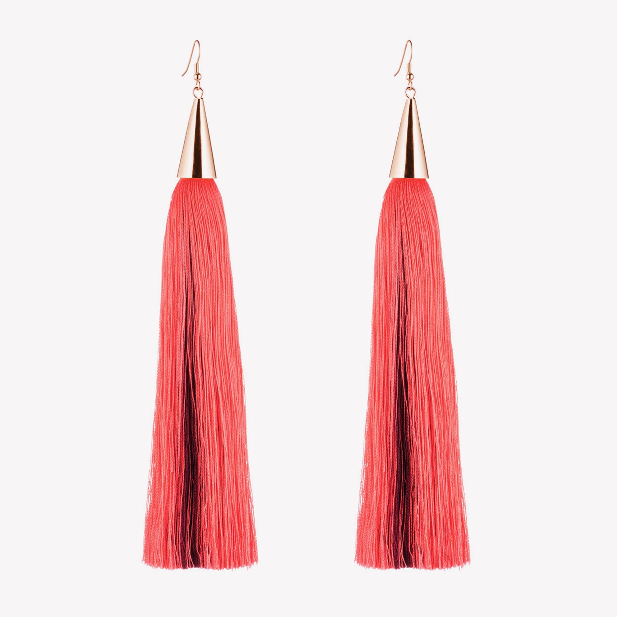 An Eddie Borgo classic, the silk tassel earrings are beautifully crafted, composed of a combination of red and garnet moroccan silk, hand threaded into a conical cap, finished in 12 Karat Rose Gold. Light in weight, these earrings are a perfect way to add color. Ear wire, for pierced ears.