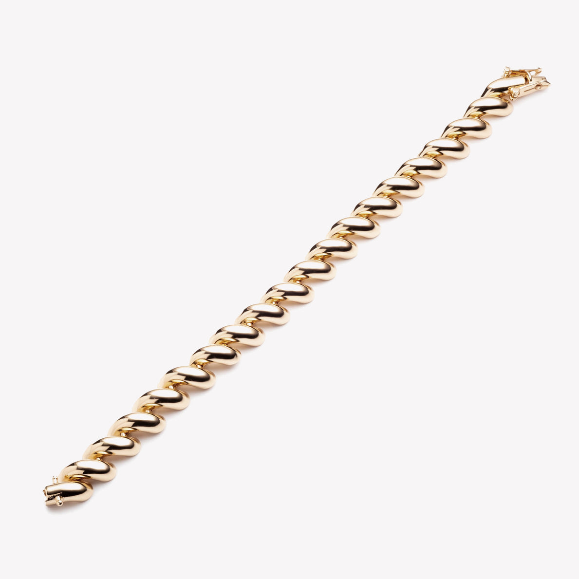 The Small Torsade Bracelet, finished in 12 Karat Gold, is composed of nineteen polished San Marco links; each station is pinned together by hand to create our signature fluidity and movement. Close with a custom Eddie Borgo box closure, secures with a double safety latch.