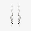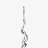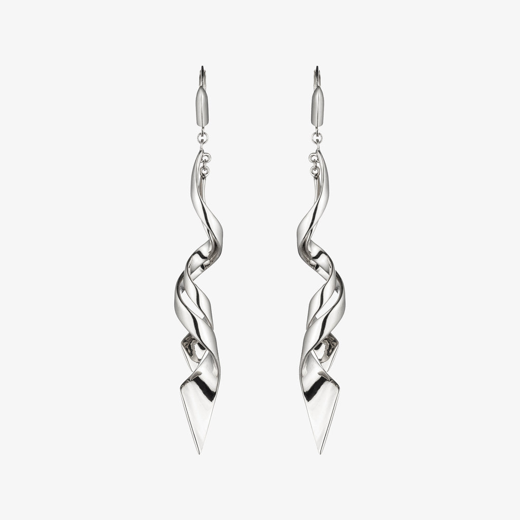 The Spiraled Ribbon earrings, finished in silver, combine two hand looped, intersecting ribbons of metal, hung from a surgical steel ear wire. These earrings were created to move with the wearer, to a dramatic effect.