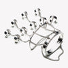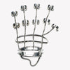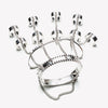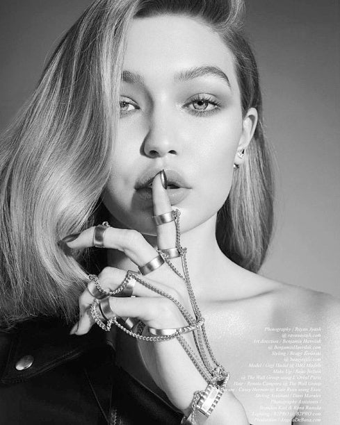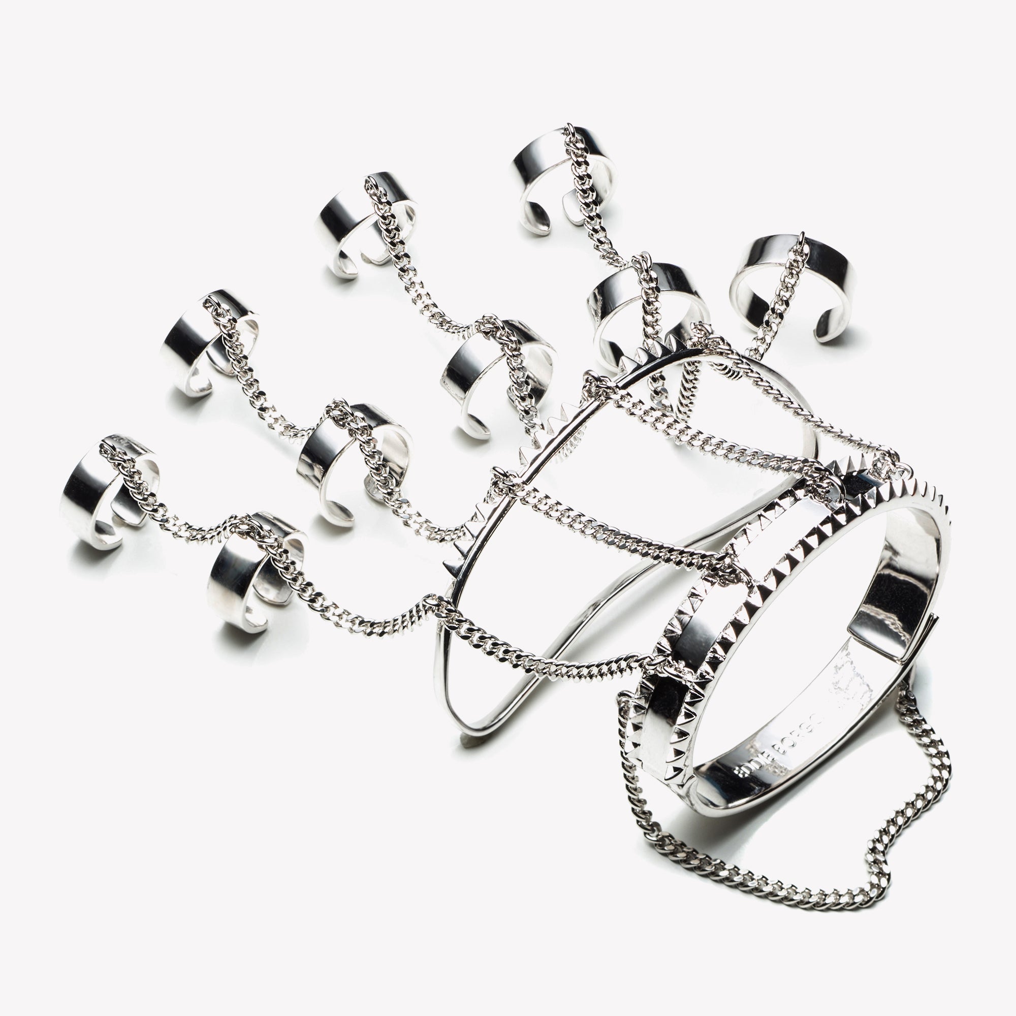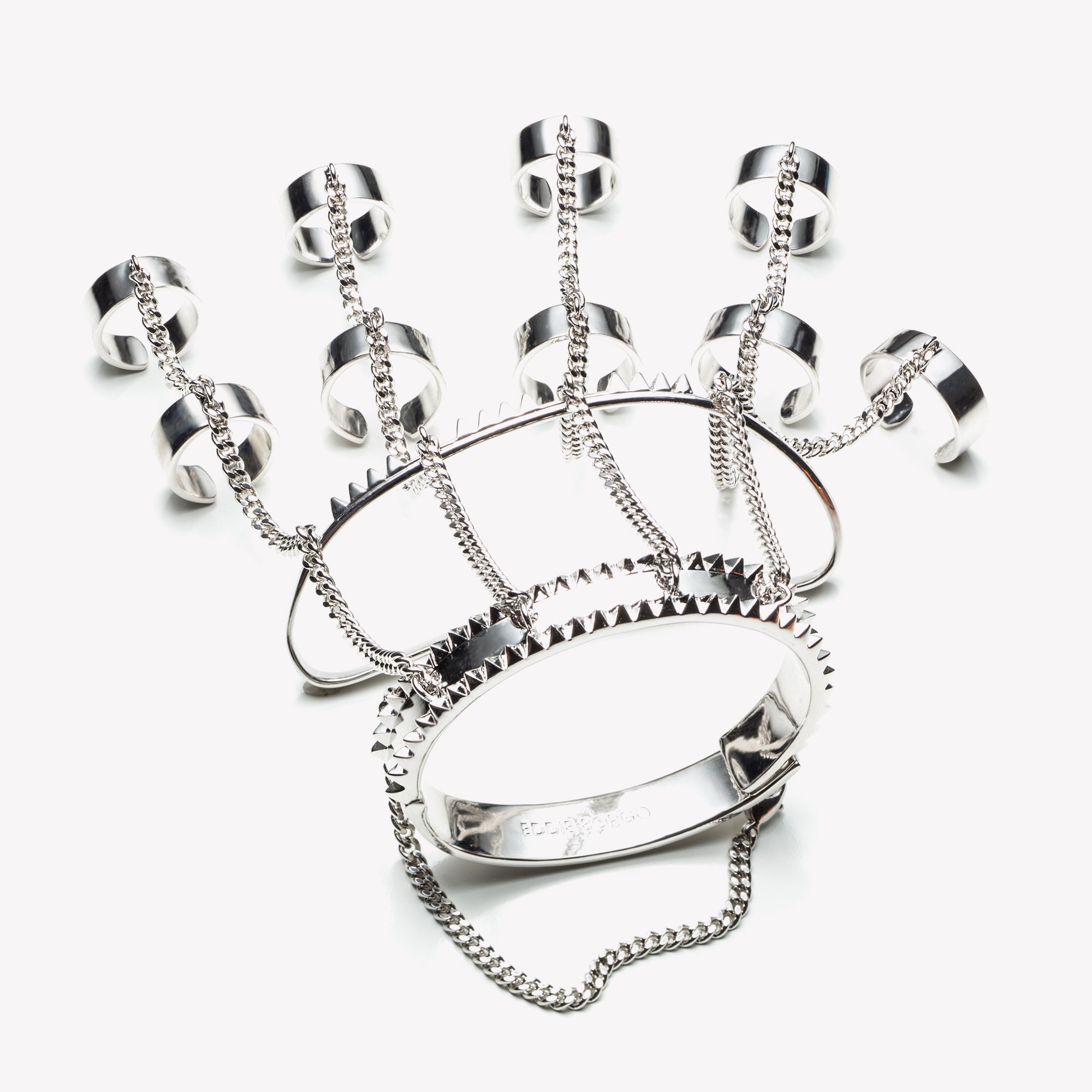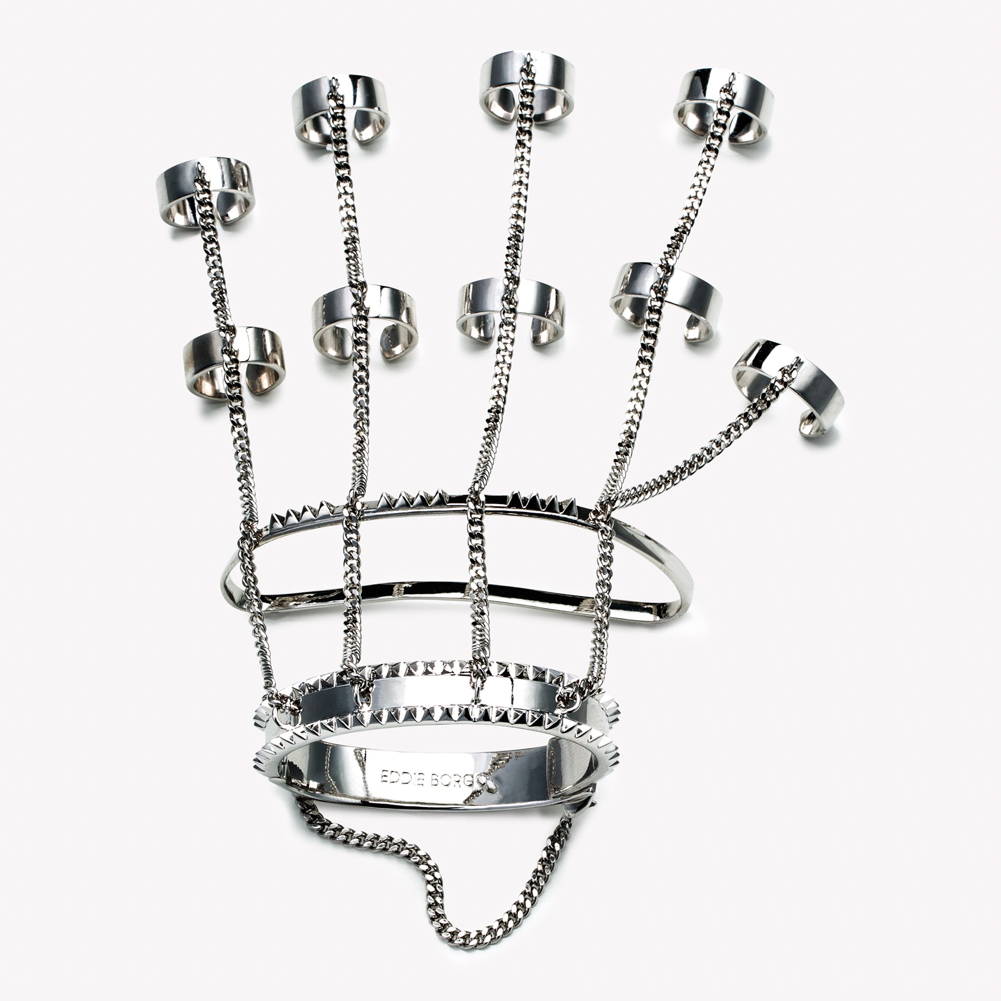 Jacket handpiece is a custom Eddie Borgo creation, finished in silver. Created from a wrist cuff, a mid-hand cuff, five adjustable rings, and four adjustable upper finger rings; all carefully joined with a delicate curb chain. The bracelet features a hand installed piano hinge which opens easily to slip onto the wrist.