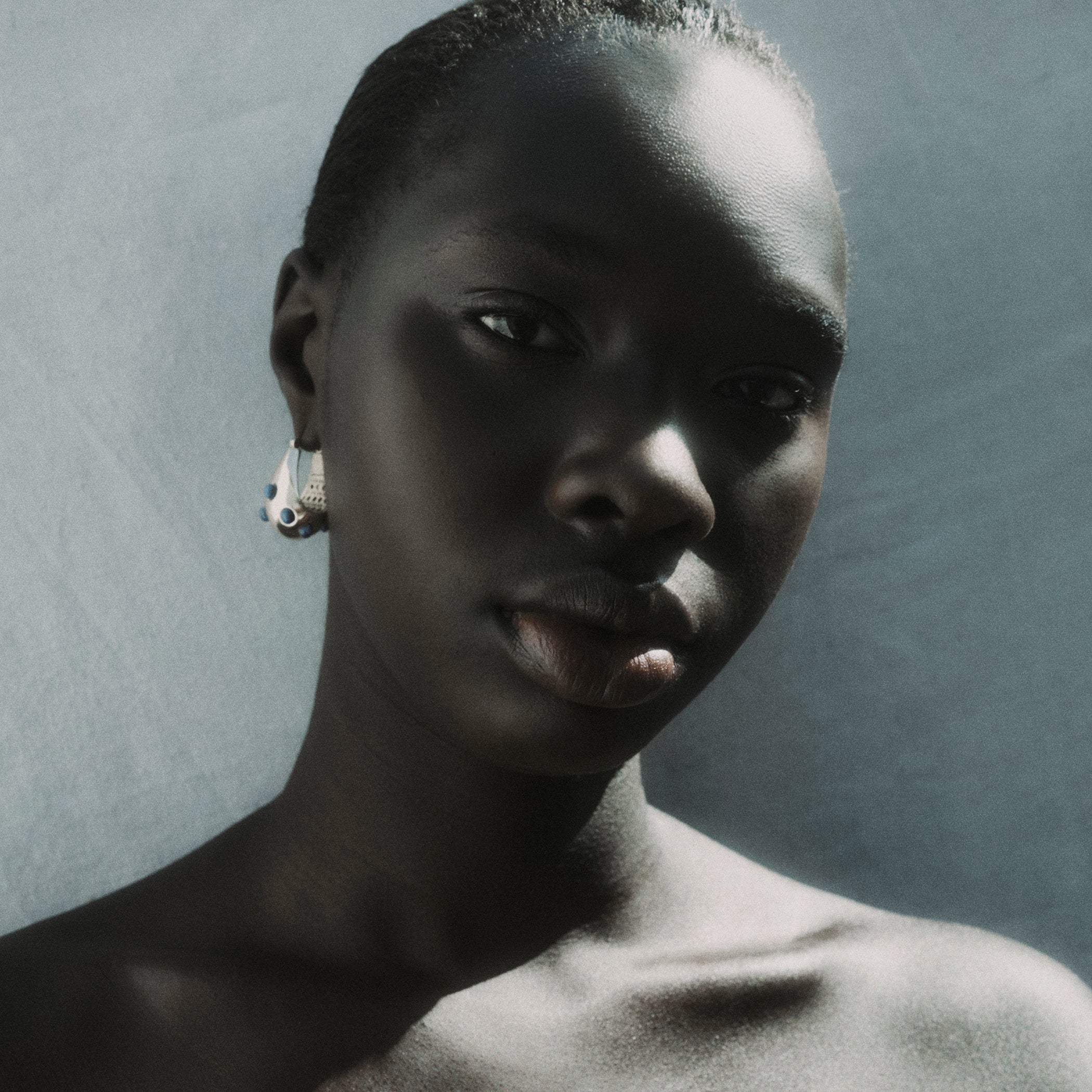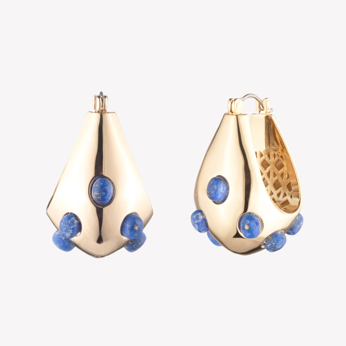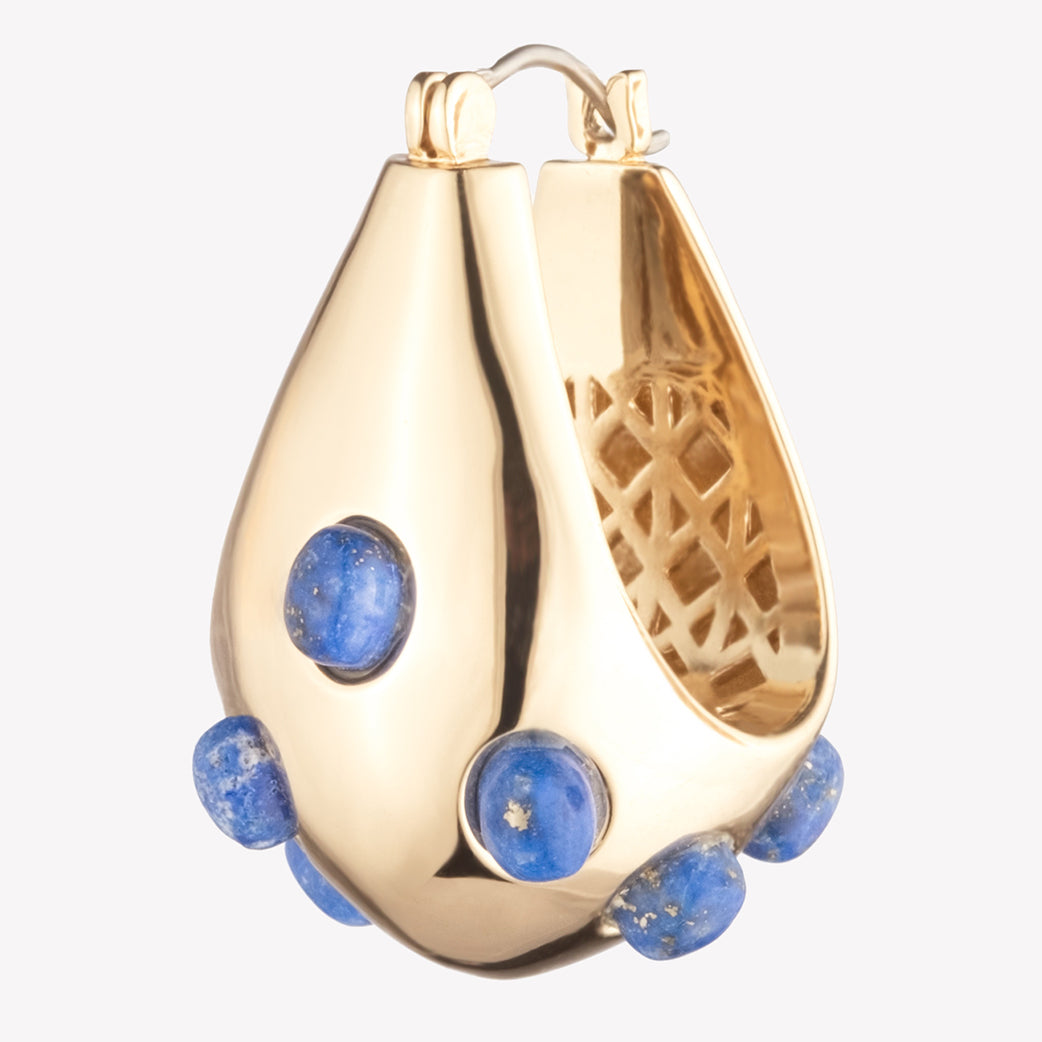 The Cabochon Teardrop Hoop Earring, finished in 12 karat gold, is a sculptural hoop earring that sits close to the ear. This lightweight earring has been sculpted as a hollow piece, caged by hand in the interior and carefully inlaid with eight hand carved lapis lazuli cabochon stones. Surgical steel posts, for pierced ears.
