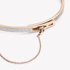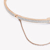 The Thin Pavé Safety Chain Choker, finished in 12 Karat Rose Gold and entirely hand set with a ribbon of pavé crystal. The neckpiece easily opens with handmade piano hinges at each side and and closes with a delicate safety chain. Wear with the chain draped in the front or down the back of the neck.