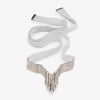 The Twill Baguette Collar, finished in Silver, is an articulated choker that fits snugly to the neck and falls to the top of the collar bone. Created by hand, this piece is designed in rows that are individually hinged together to meet at a point in the front. The front of the collar is set with baguette crystals for subtle shimmer. The soft velvet ties adjust for the perfect fit.