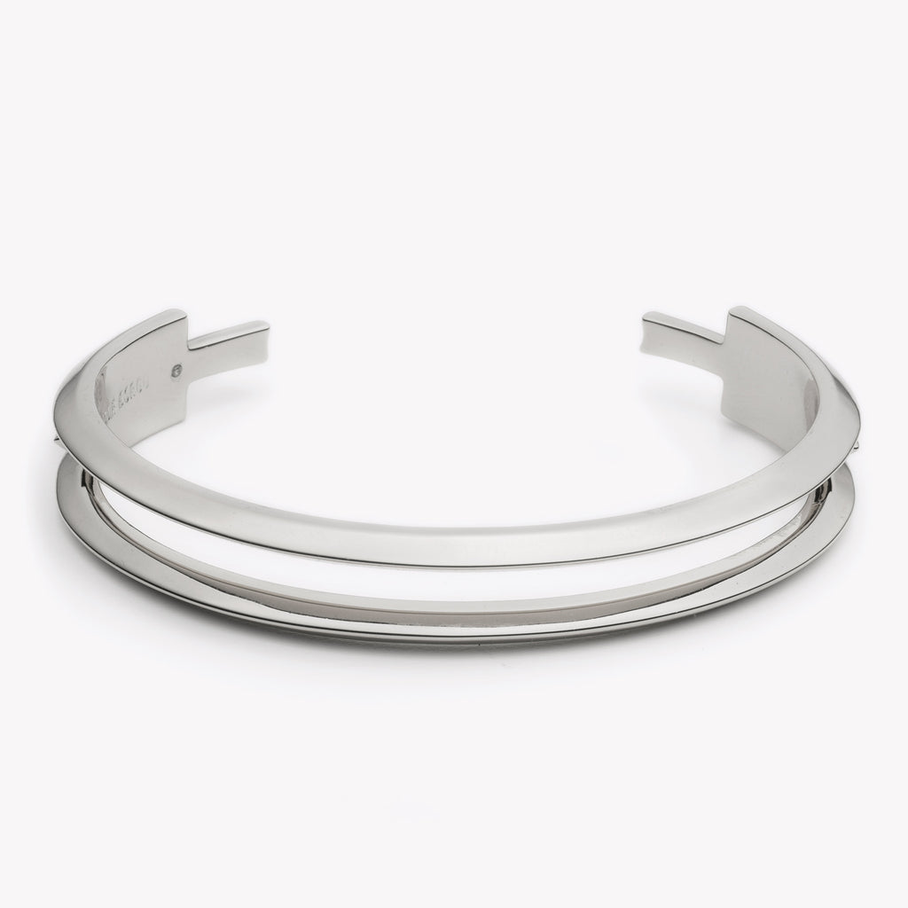 The Twill Cuff, finished in silver, is a classic slip on cuff bracelet. This special piece is created by hand, by carefully molding faceted bars into an architectural bracelet. Slip onto the wrist to wear.