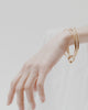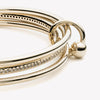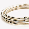 THE VOYAGER BANGLE SET, Finished IN 12 KARAT GOLD, CONSISTS OF THREE HAND FORMED BANGLES, JOINED TOGETHER BY A DELICATE BARBELL RING. TWO AS SOLID BANDS, ONE INTRICATELY SET WITH A SINGLE ROW OF PAVÉ CRYSTAL, AND THE THIRD CENTERED WITH A SINGULAR ROUND CUT, FACETED CRYSTAL STONE. THE SET EASILY SLIPS ONTO THE WRIST AND IS COMFORTABLE TO WEAR THROUGHOUT THE DAY.