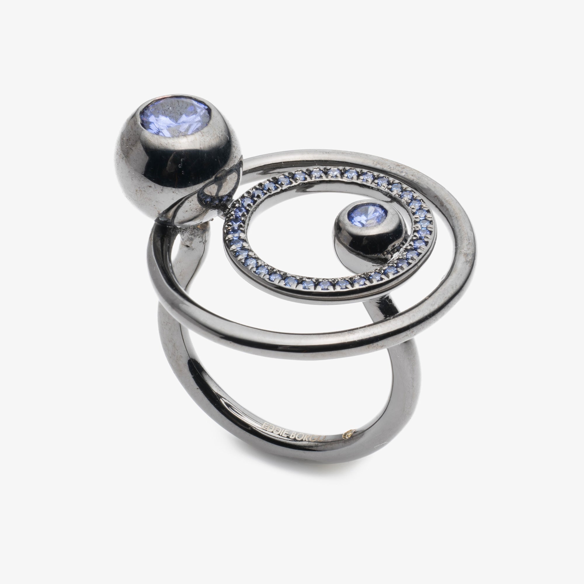THE VOYAGER RING, finished IN BLACKENED SILVER, HAS BEEN HAND SET WITH SPARKLING SAPPHIRE BLUE CRYSTAL PAVÉ AND ROUND CUT STONES. MEANT TO EVOKE THE RELATIONSHIP OF THE PLANET NEPTUNE WITH THE SUN, THIS RING HAS BEEN HAND FORMED TO COMBINE NON-CONCENTRIC RINGS AND INTERSECTING ORBS OF CRYSTAL. LEFT OPEN, THE WEARER'S FINGER IS VISIBLE THROUGH THE CENTER OF THIS UNIQUE PIECE.