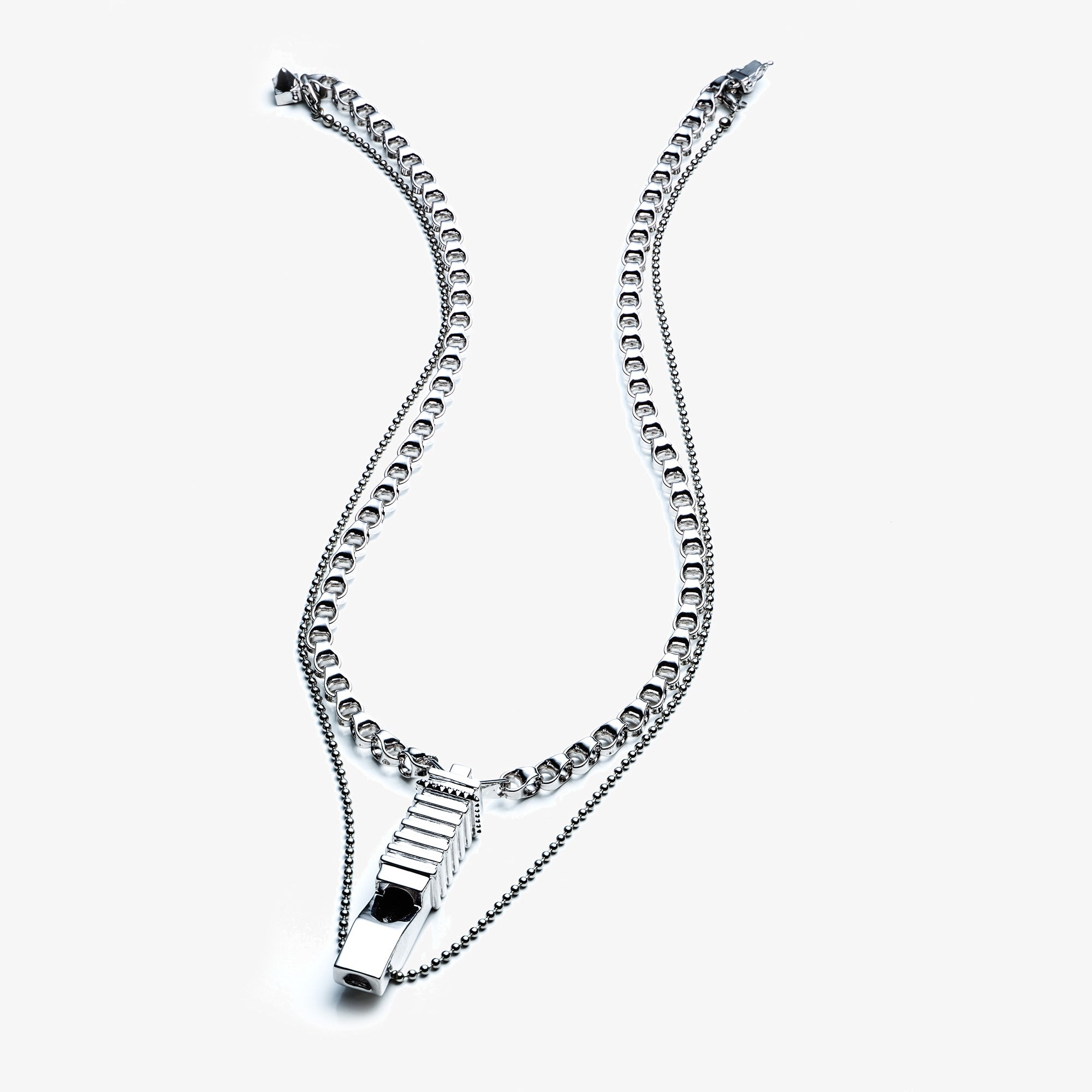 The Eddie Borgo Whistle Pendant, finished in silver, is a one-of-a-kind piece, hung with a functioning whistle pendant. The whistle has been hand carved in totem form, with striated, decorative grooves - and accented with a delicate band of signature pyramids. A handmade Eddie Borgo looped link chain lays alongside a delicate ball chain for a layered effect.